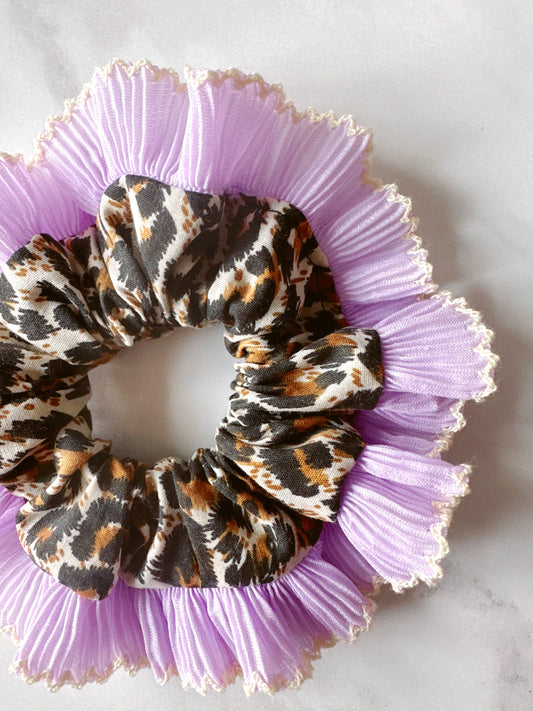 Mini Oversized Leopard Print Scrunchie with a Purple Frill Trim