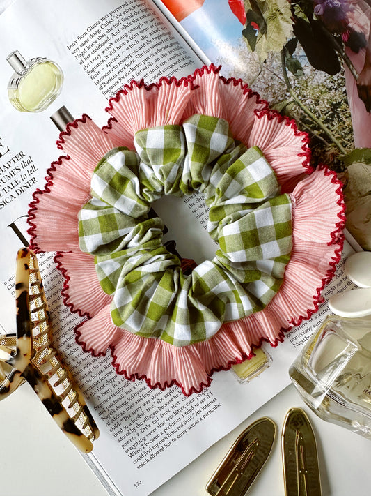 Handmade XL Olive Green Gingham Scrunchie with Pink Frill Trim