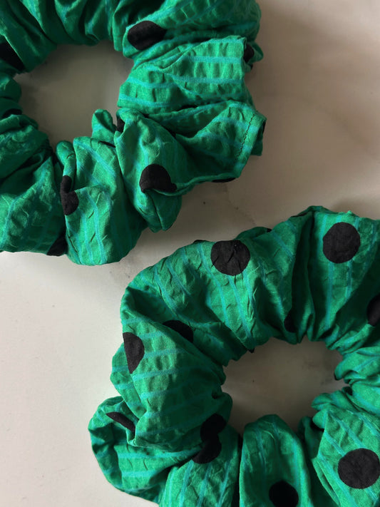 XL Green and Black Polkadot and Striped Scrunchie