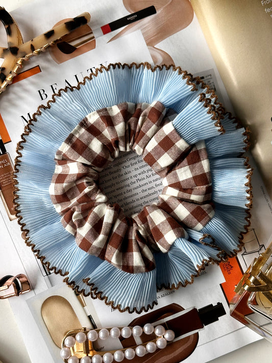 Handmade XL Brown Gingham Scrunchie with Blue and Brown Frill Trim