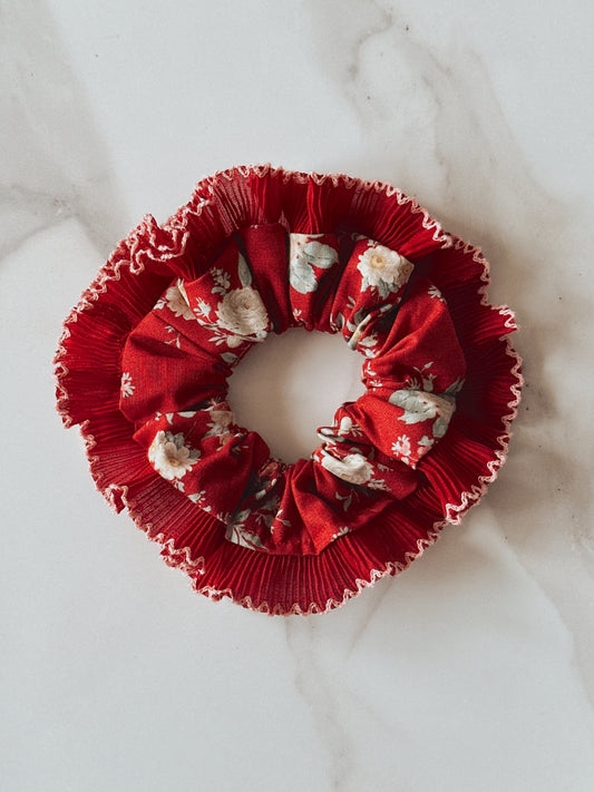 Red Floral Scrunchie with Red and Pink Frill Trim