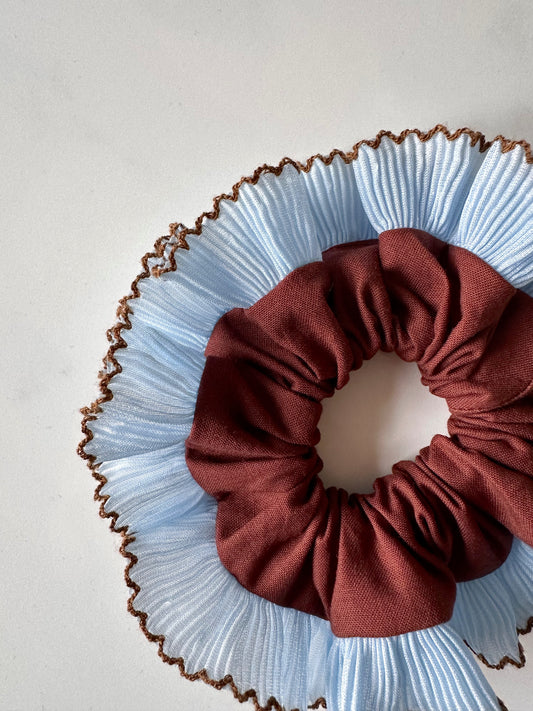 Mini Oversized Brown Scrunchie with Baby Blue Frill Trim