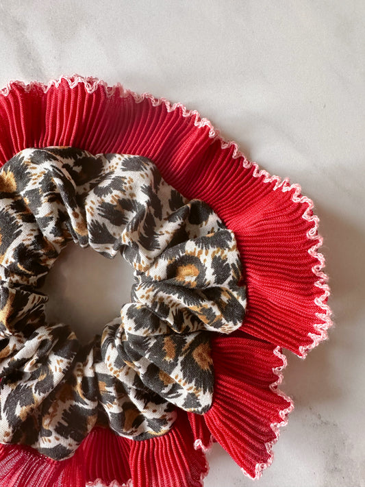 Mini Oversized Leopard Print Scrunchie with a Red Frill Trim