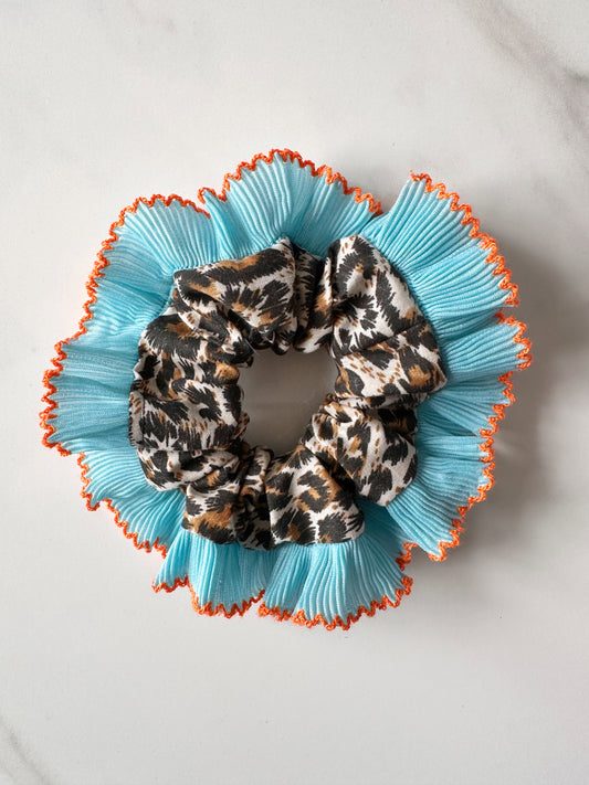 Mini Oversized Leopard Print Scrunchie with a Blue Frill Trim
