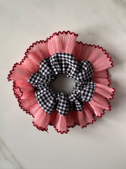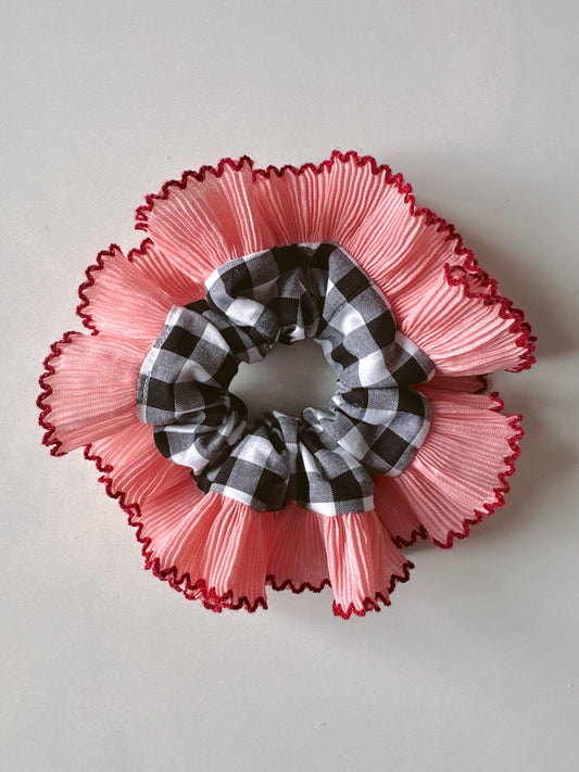 Mini Oversized Black Gingham Scrunchie with Pink Frill Trim