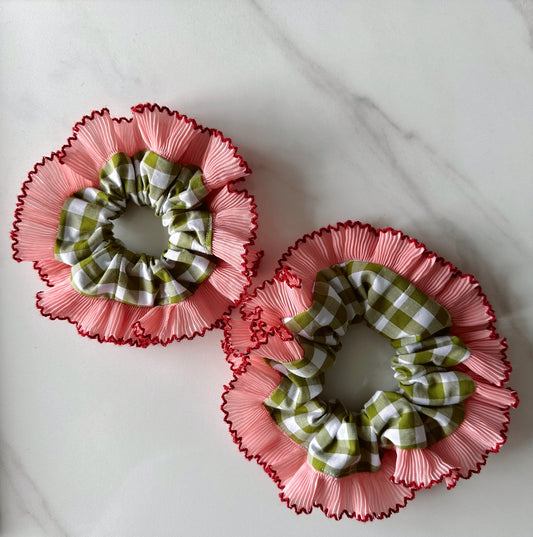 Mini Oversized Olive Green Gingham Scrunchie with Pink Frill Trim