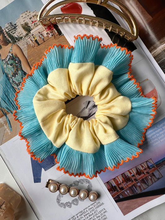 Mini Oversized Butter Yellow Scrunchie with Blue Frill Trim