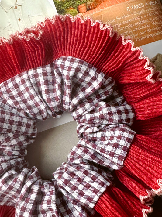 Mini Mulberry Gingham Scrunchie with Red Frill Trim