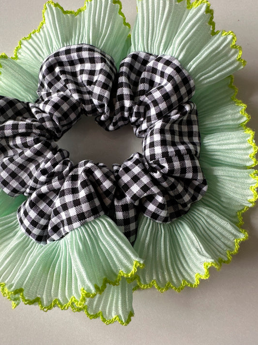 Mini Oversized Black Gingham Scrunchie with Green Frill Trim