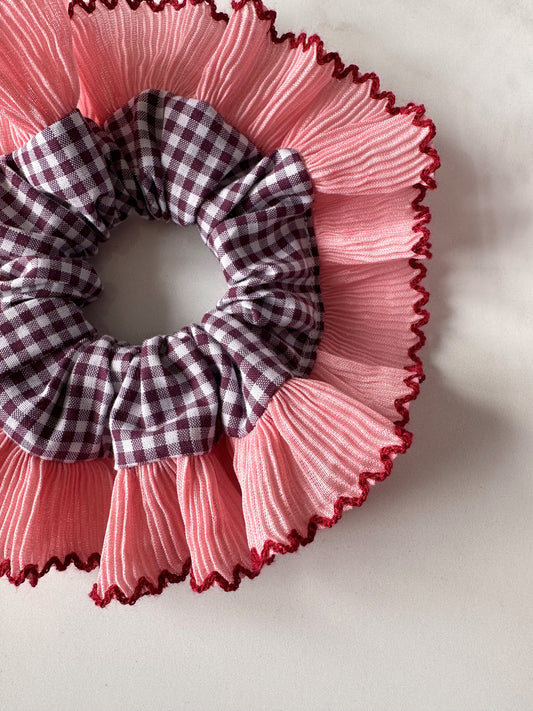 Mini Mulberry Gingham Scrunchie with Pink Frill Trim