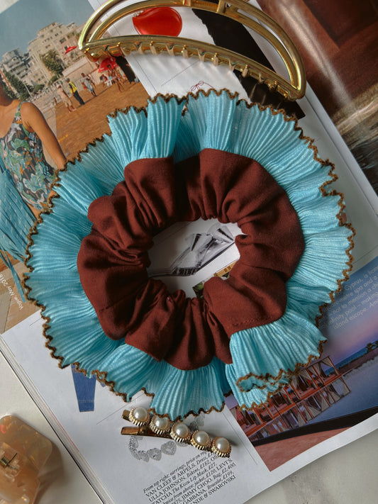 Mini Oversized Brown Scrunchie with Blue Frill Trim