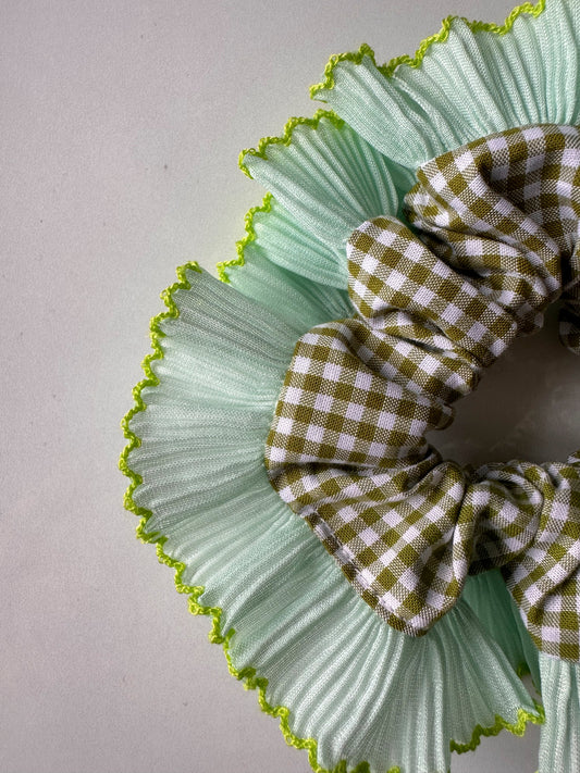 Mini Oversized Olive Green Gingham Scrunchie with Green Frill Trim