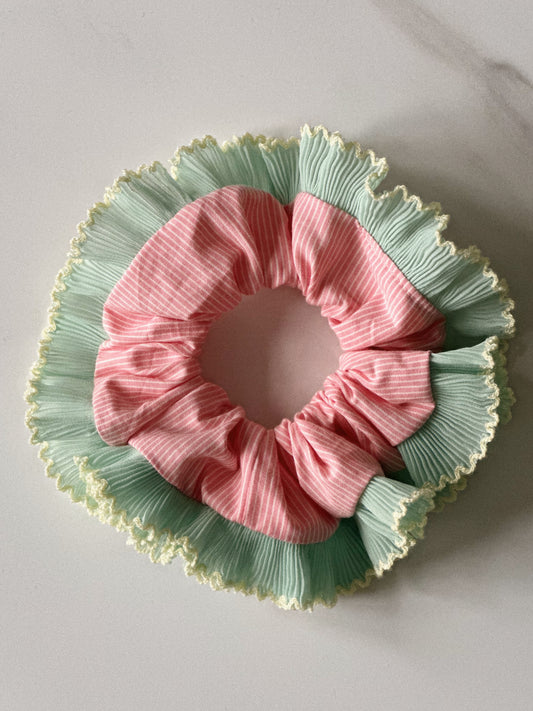 Pink Striped Scrunchie with Green and Cream Frill Trim