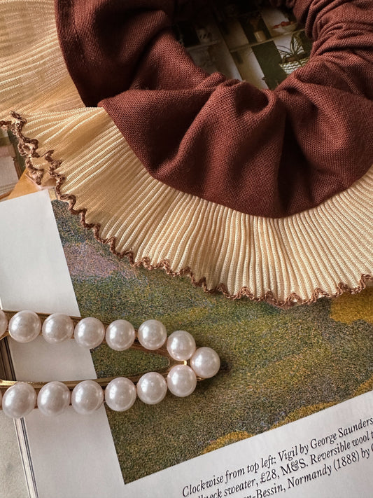 XL Brown Scrunchie with Cream and Brown Frill Trim