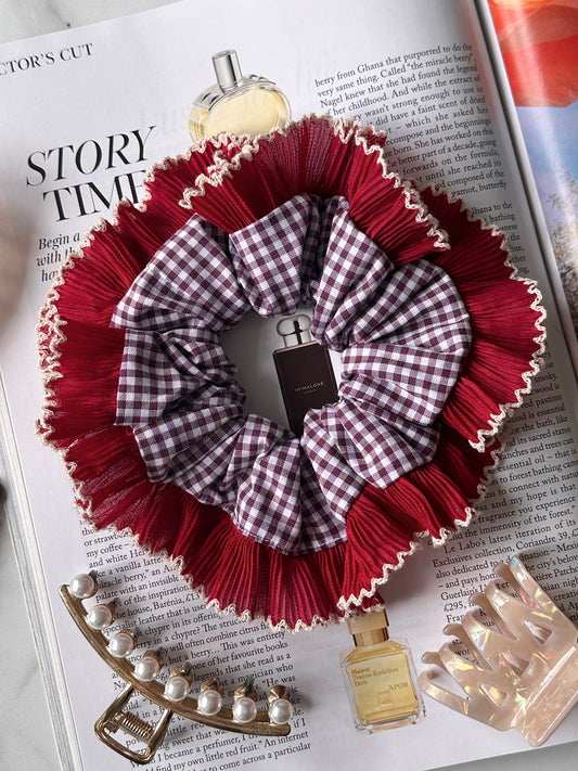 XL Mulberry Gingham Scrunchie with Red and White Frill Trim