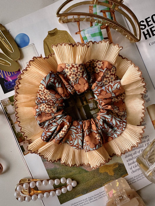 XL Brown Floral Scrunchie with Cream and Brown Frill Trim