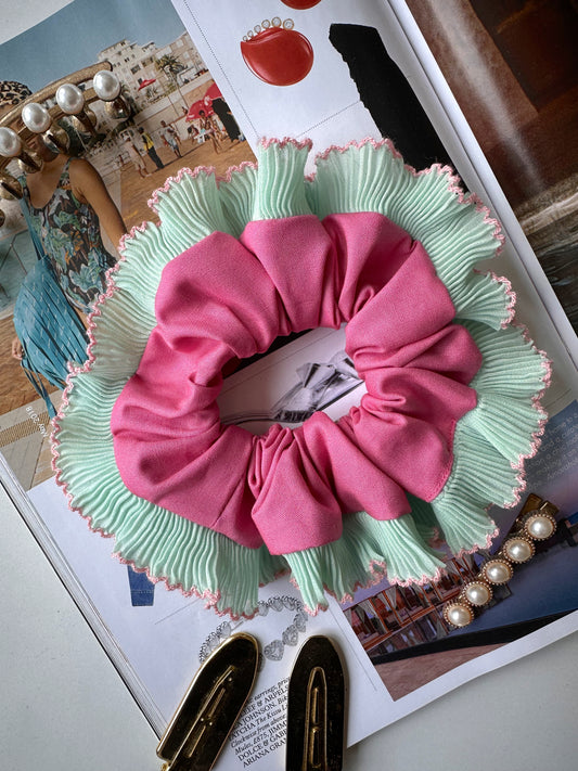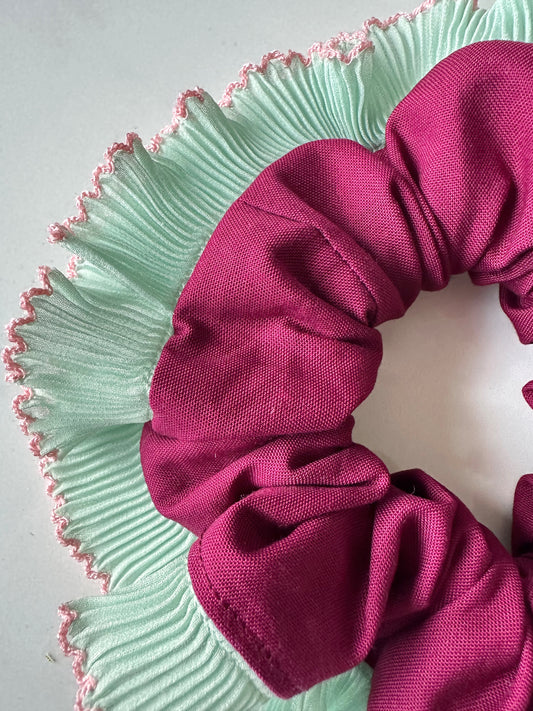 Pink Scrunchie with Green and Pink Frill Trim