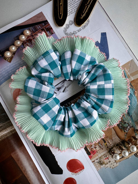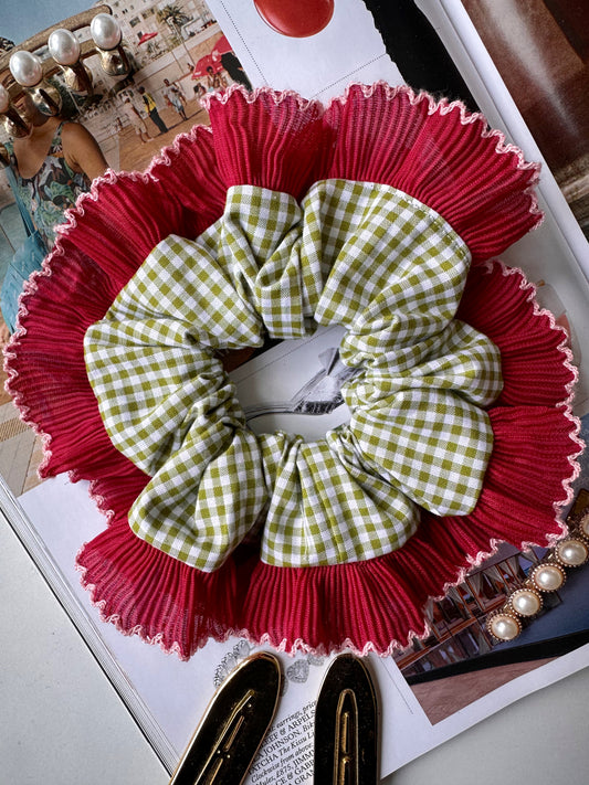 Olive Green Gingham Scrunchie with Red and Pink Frill Trim