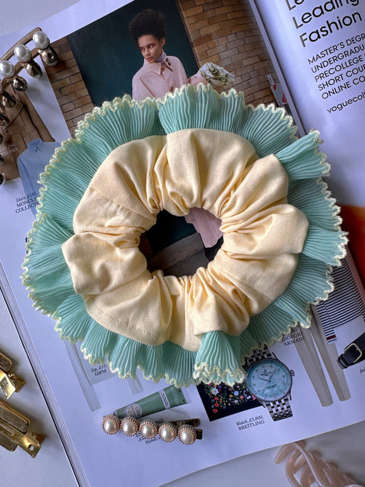 Oversized Butter Yellow Scrunchie with Mint Green Frill Trim