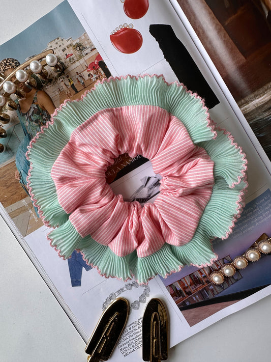 Pink Striped Scrunchie with Green and Pink Frill Trim