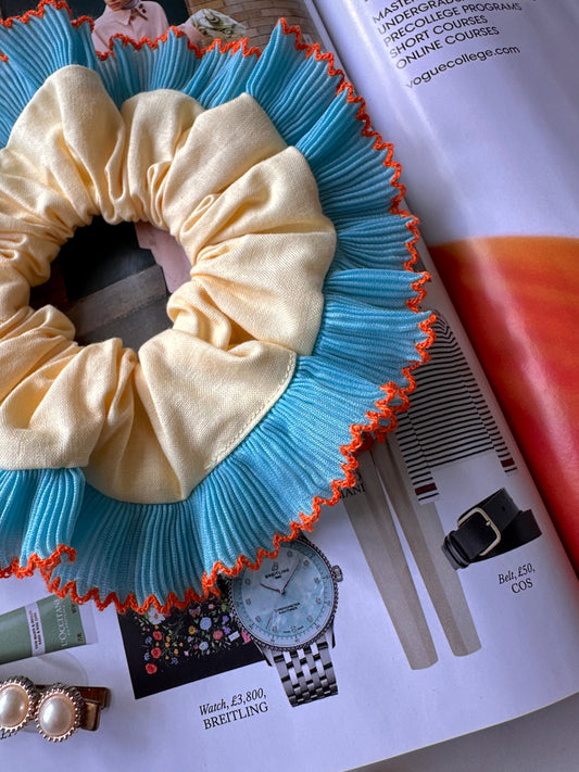 Oversized Butter Yellow Scrunchie with Blue Frill Trim