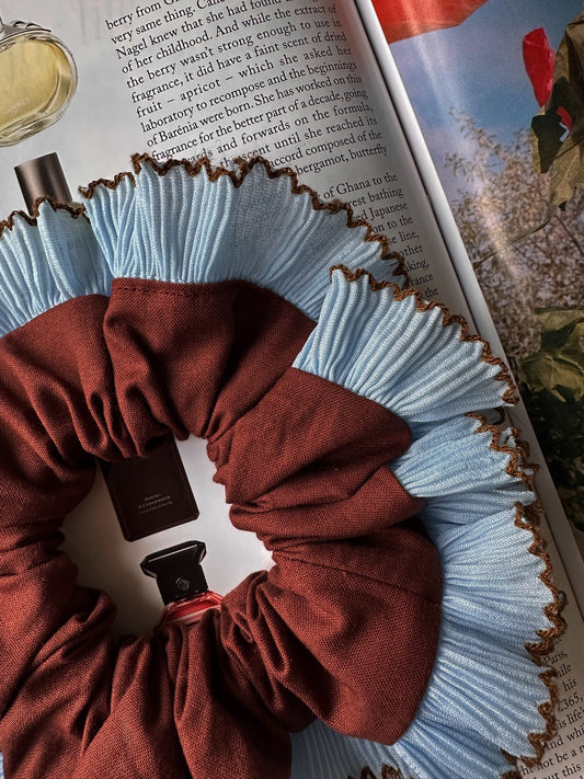 XL Chocolate Brown Scrunchie with Baby Blue Frill Trim