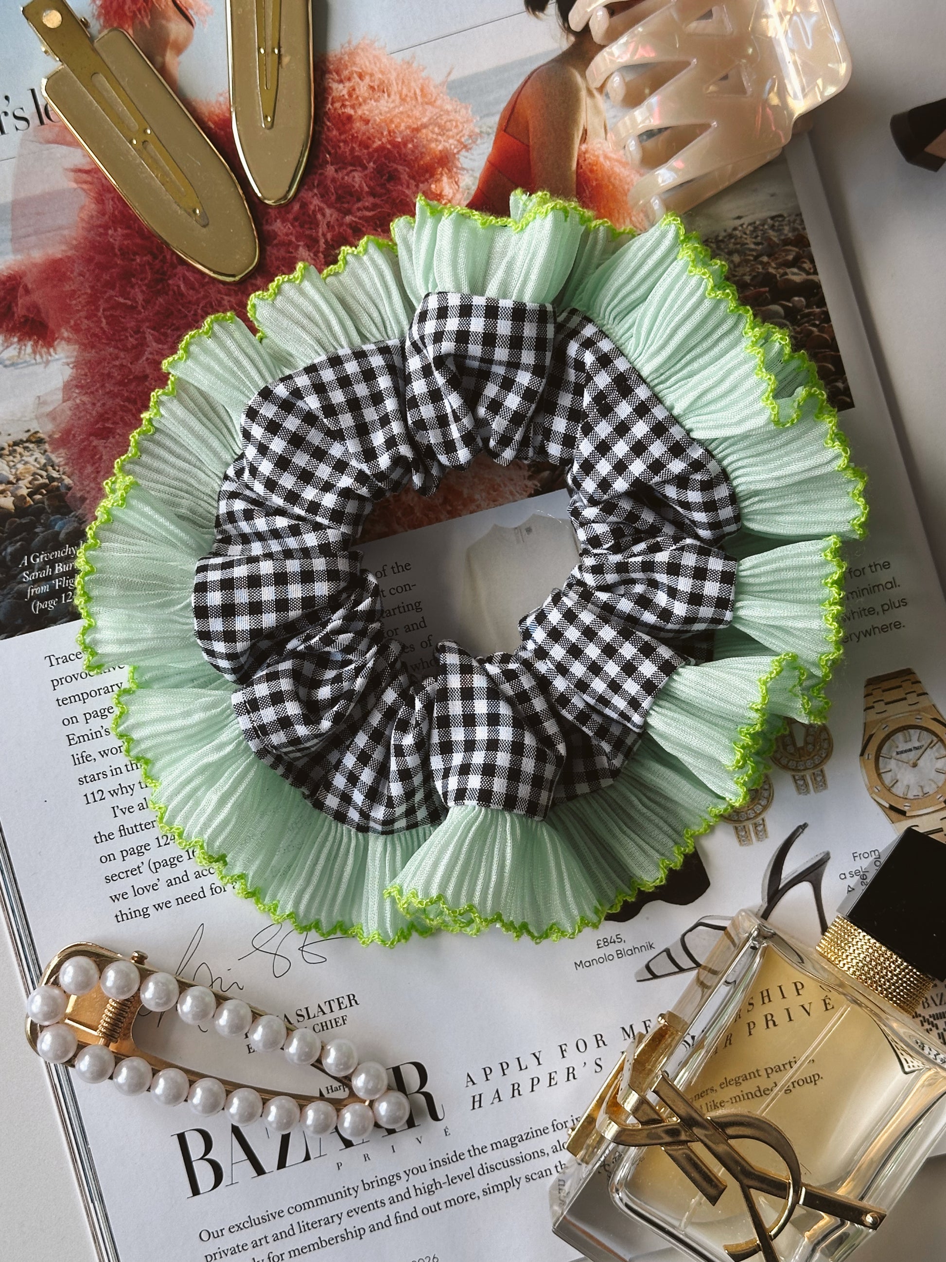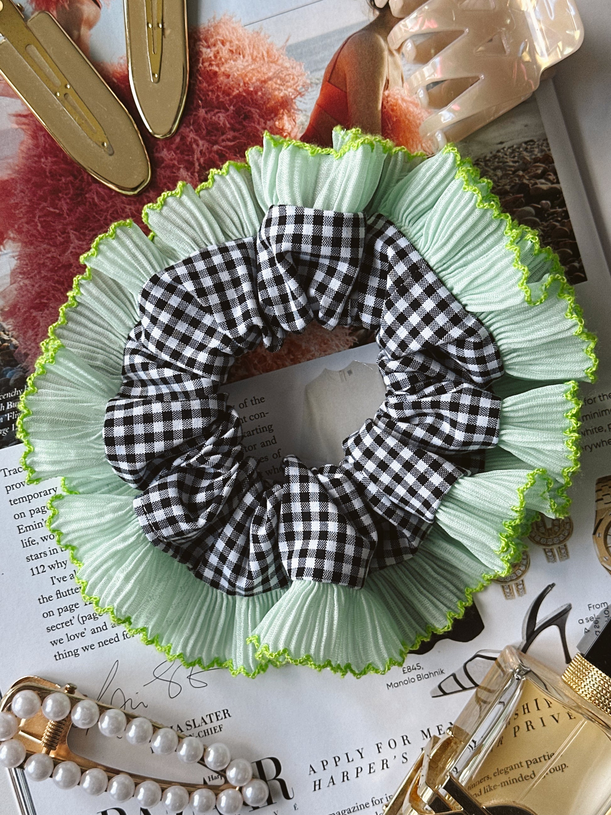 Embrace the scrunchie trend with this stunning black gingham scrunchie with a mint green frill trim. These single-layer trim scrunchies are perfect for making your hair stand out all year round.