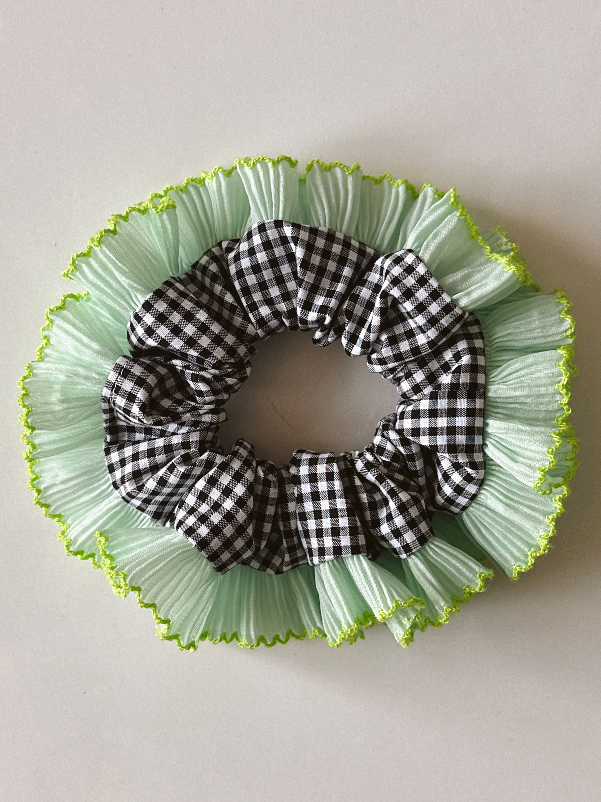 Black Gingham Scrunchie with Mint Green Frill Trim