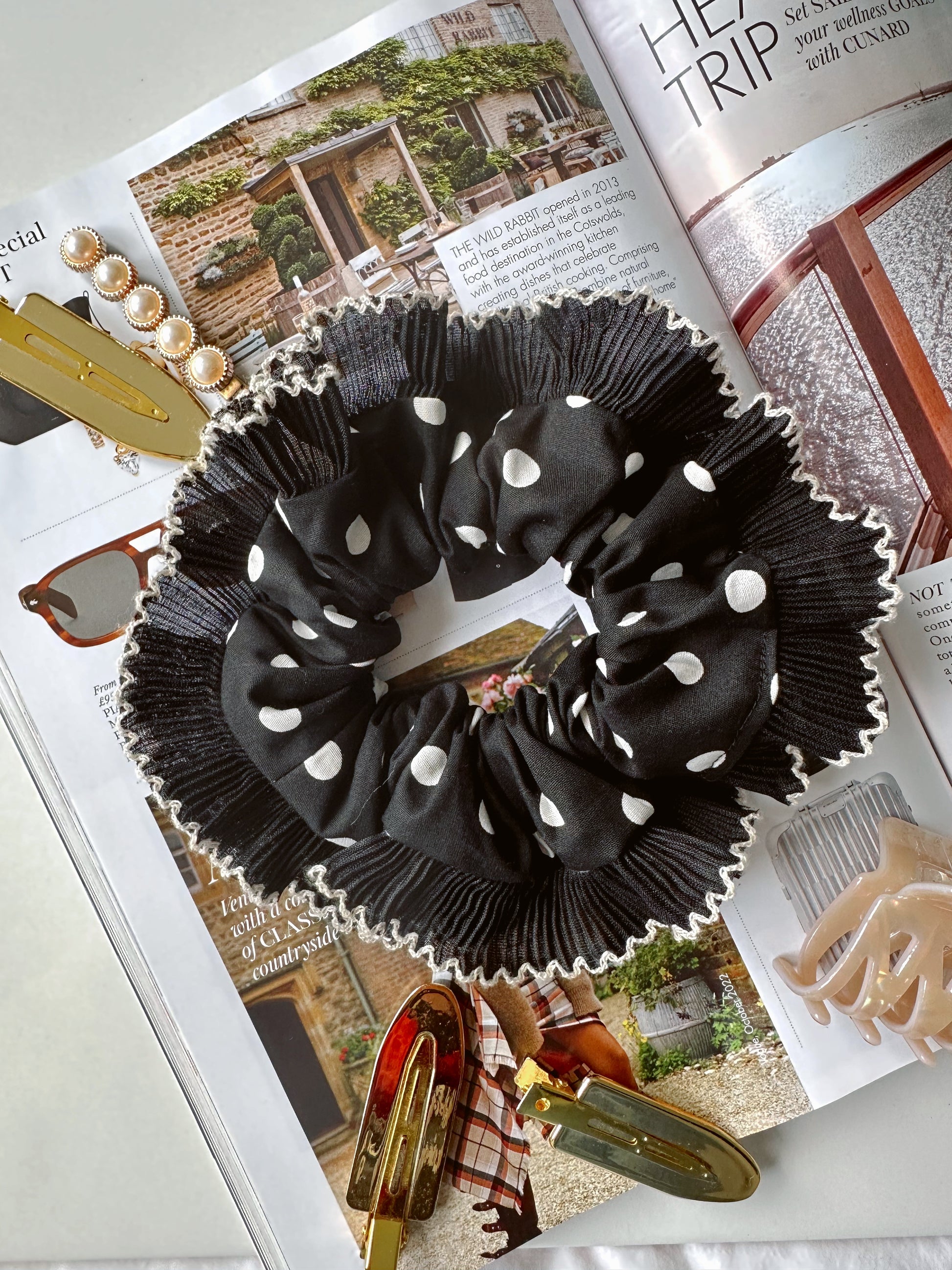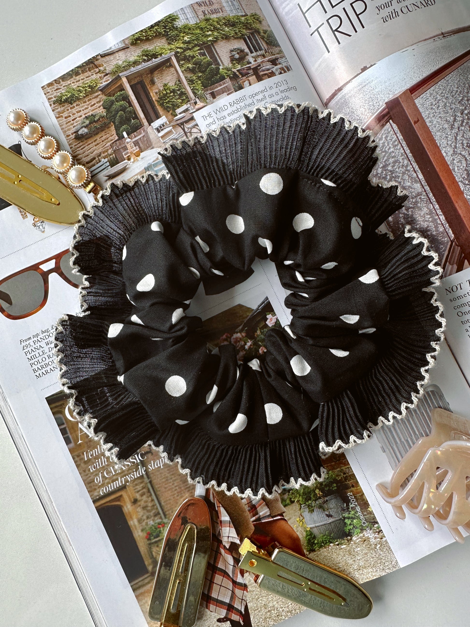 XL Black Polkadot Scrunchie with Black and White Frill Trim