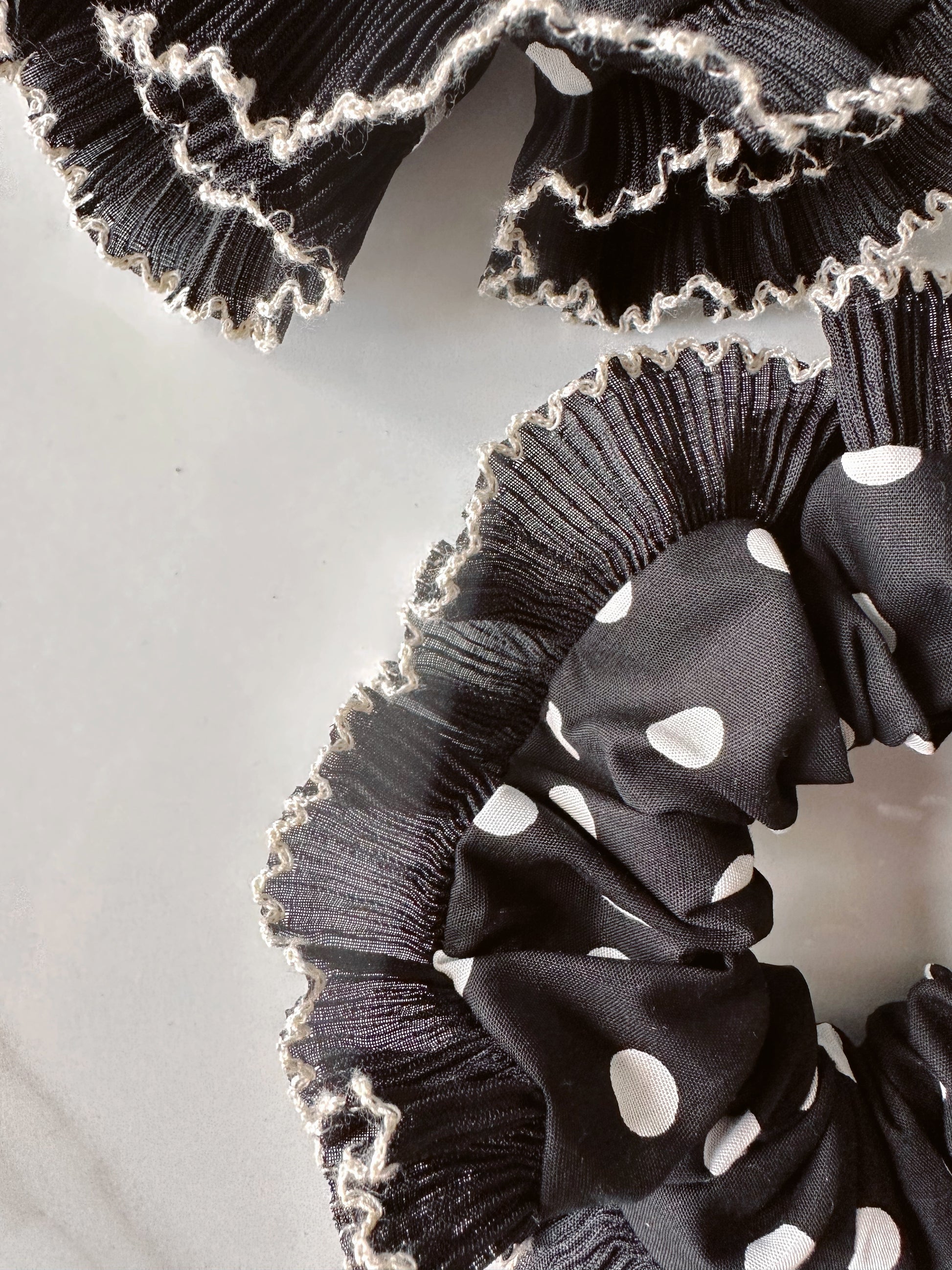 Embrace the scrunchie trend with this stunning black polkadot scrunchie with a black and white frill trim. These single-layer trim scrunchies are perfect for making your hair stand out all year round.
