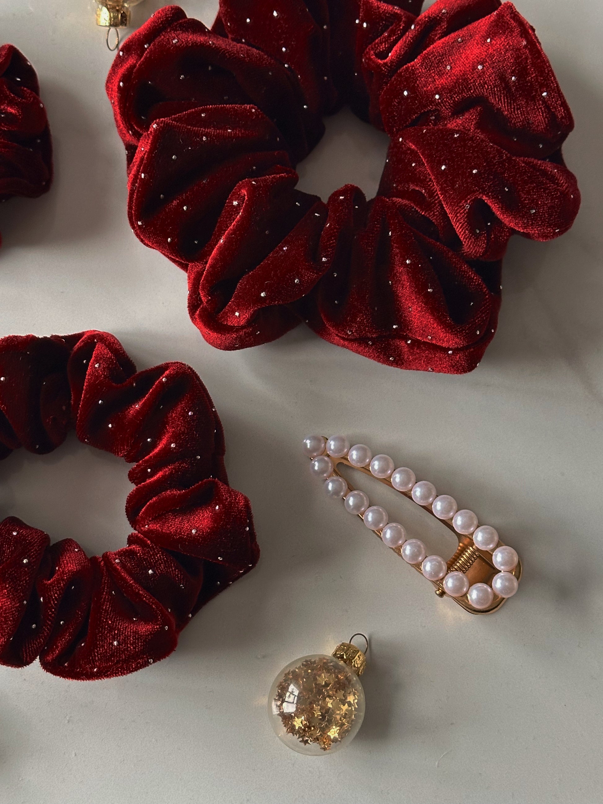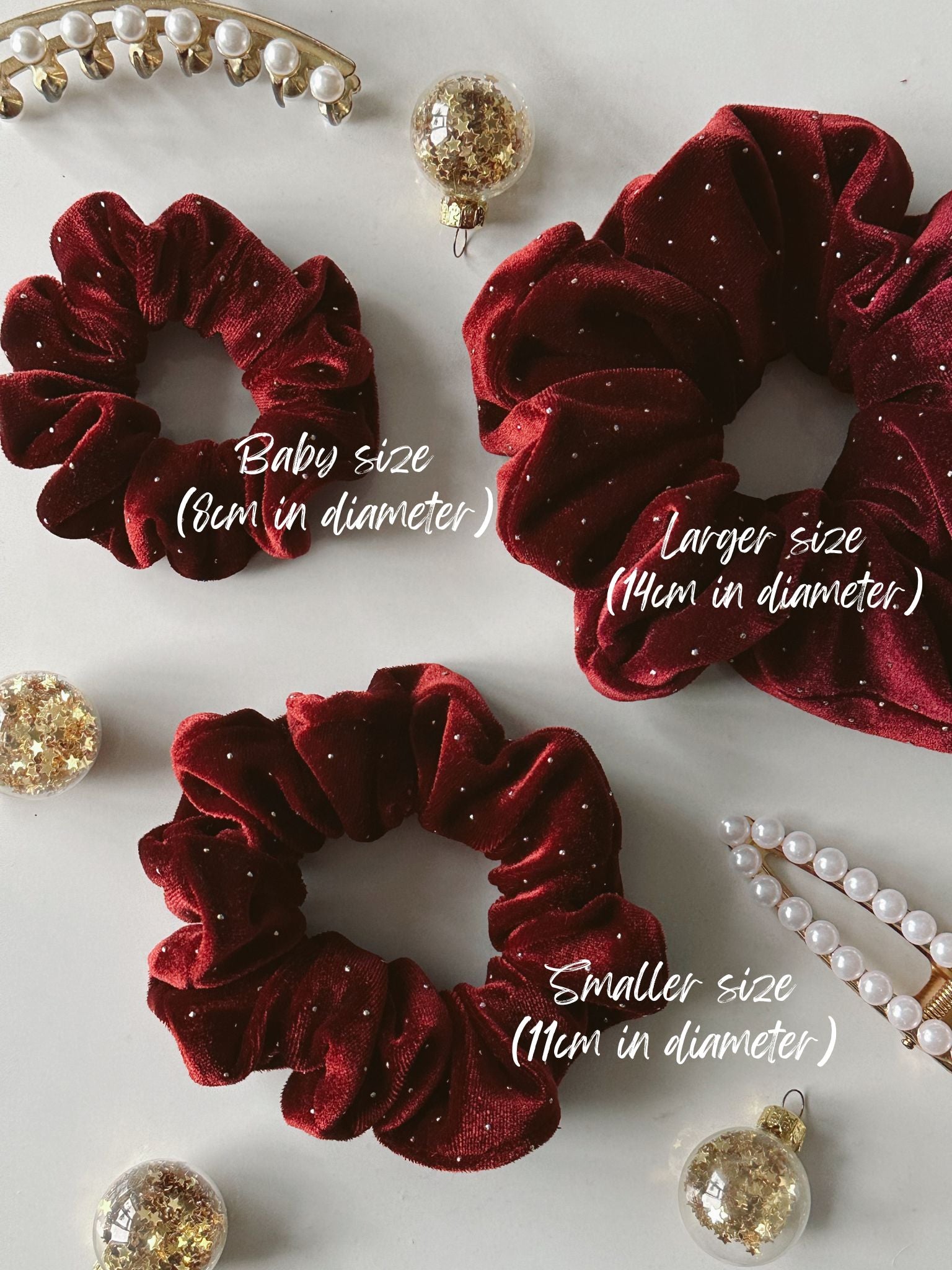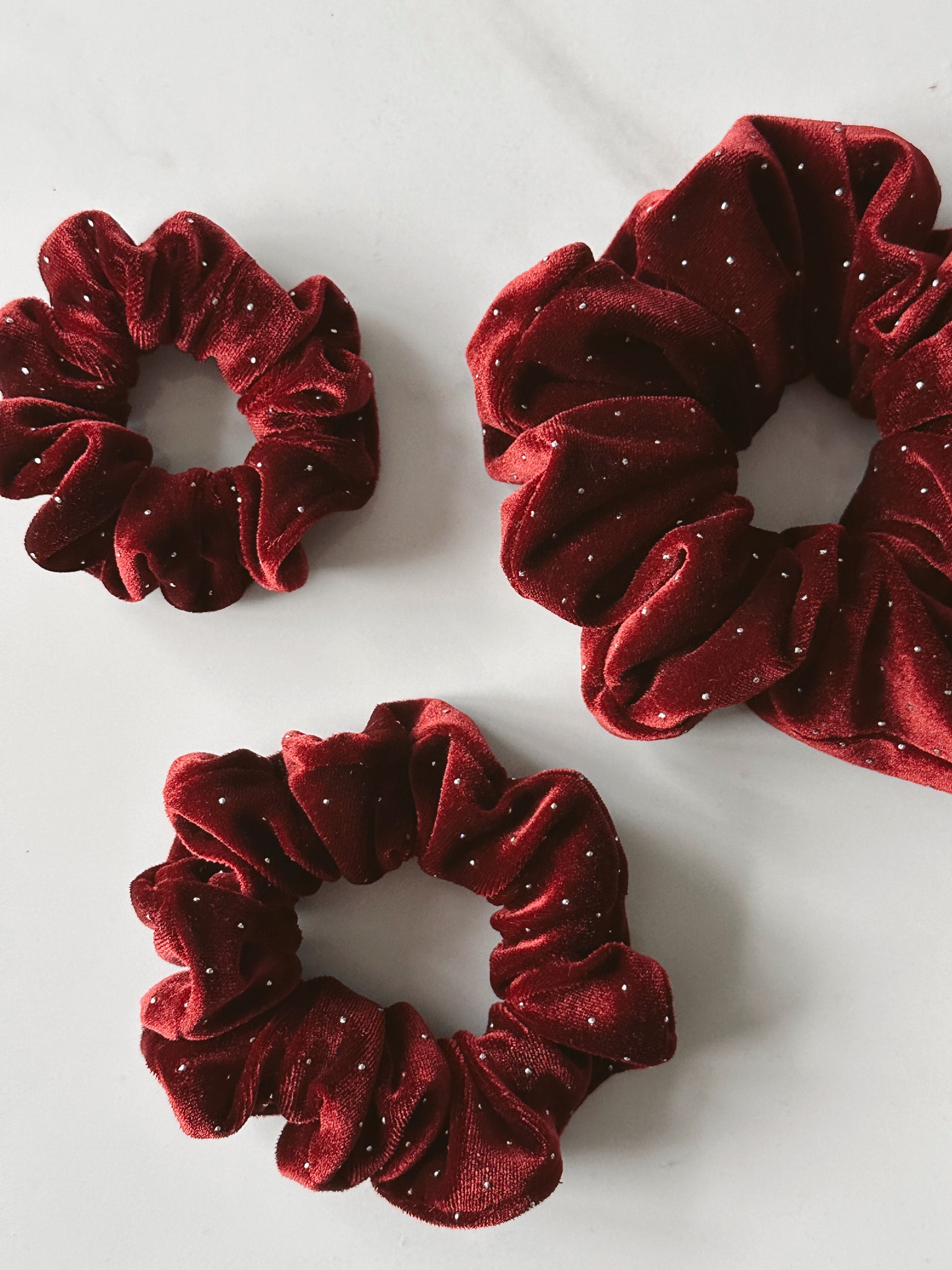Crafted from soft, plush velvet, this scrunchie offers a comfortable yet secure hold that’s gentle on your hair and helps minimize pulling and breakage. The deep burgundy tone brings richness and elegance, while the subtle silver detailing adds a refined shimmer that catches the light beautifully.