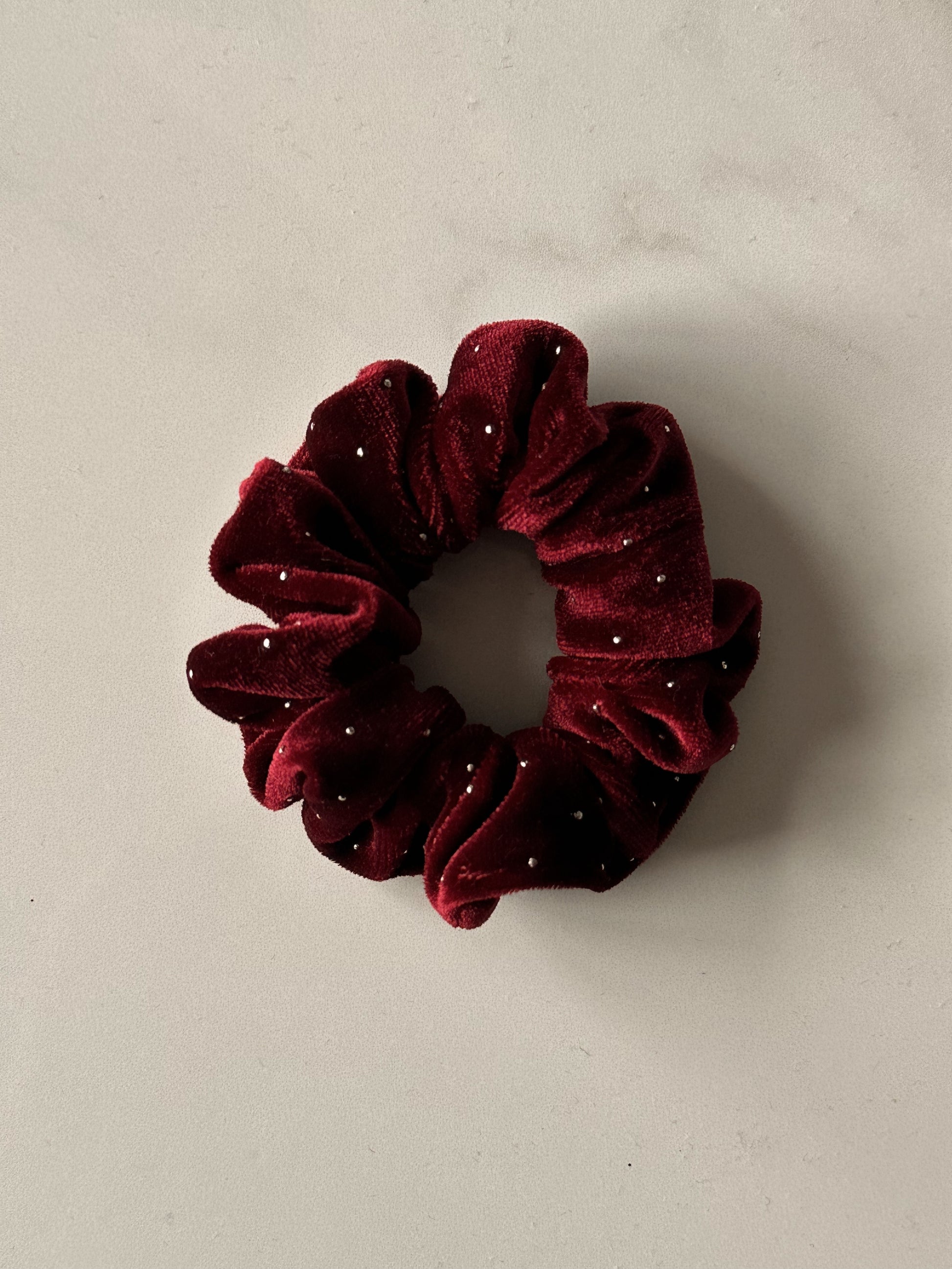 Add a touch of luxury to your hairstyle with this Burgundy Velvet Scrunchie with Silver Detailing.
