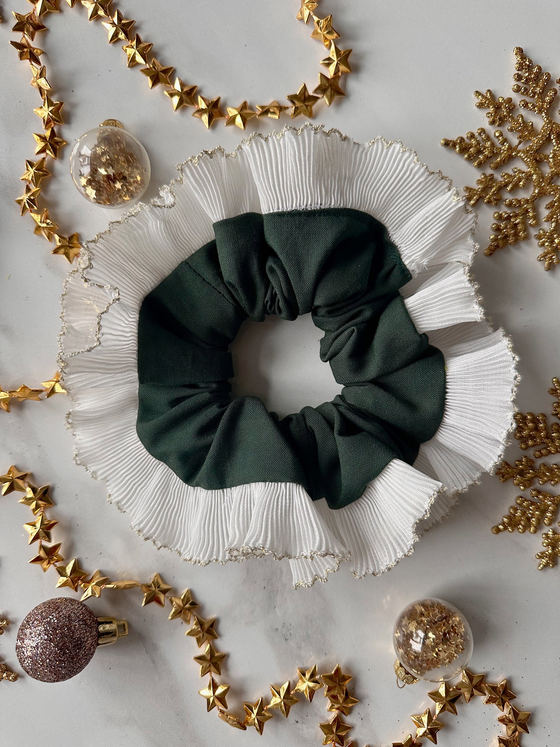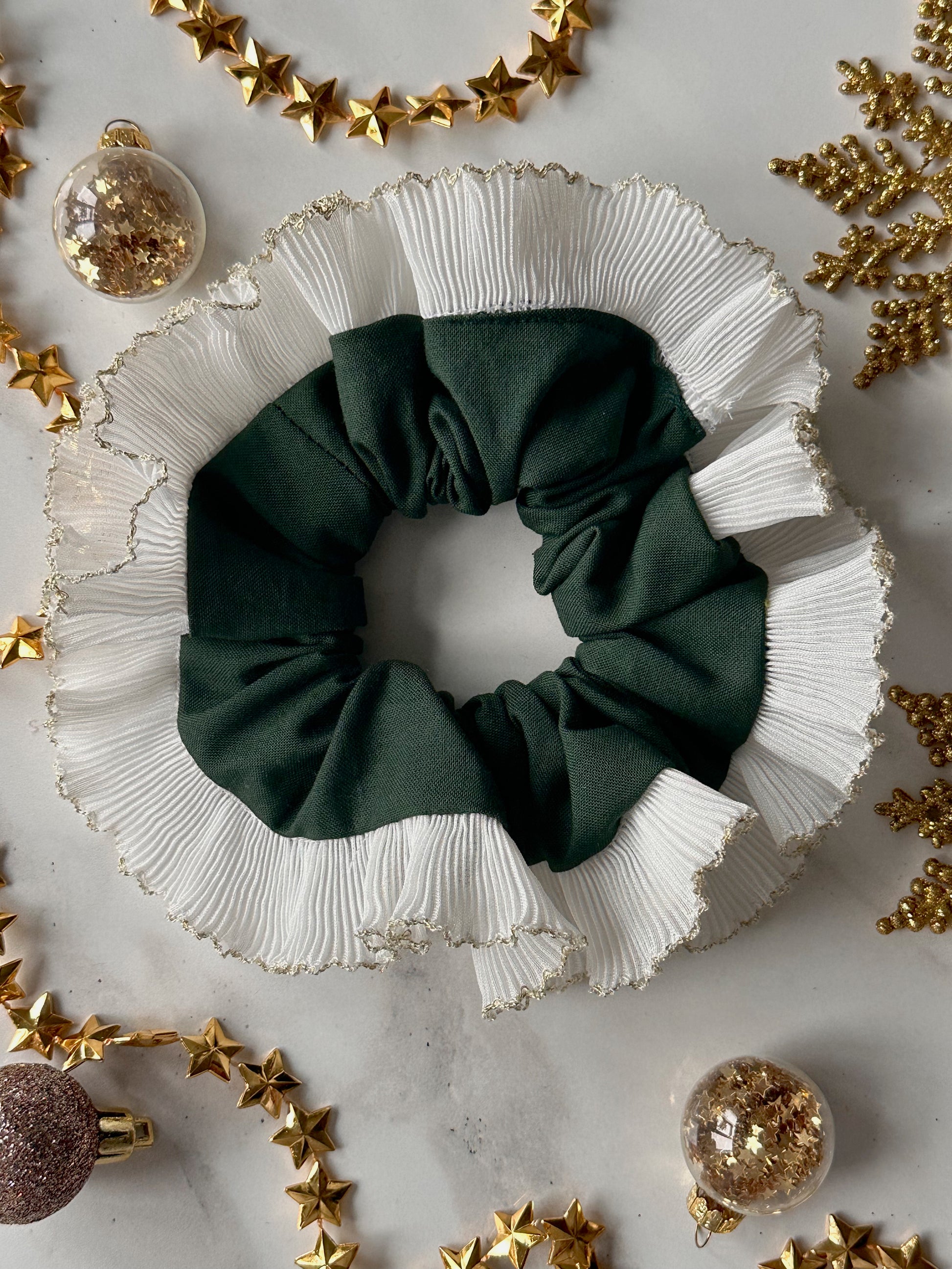 Embrace the scrunchie trend with this forest green scrunchie with a white and gold glittery frill trim. These single-layer trim scrunchies are perfect for making your hair stand out all year round.