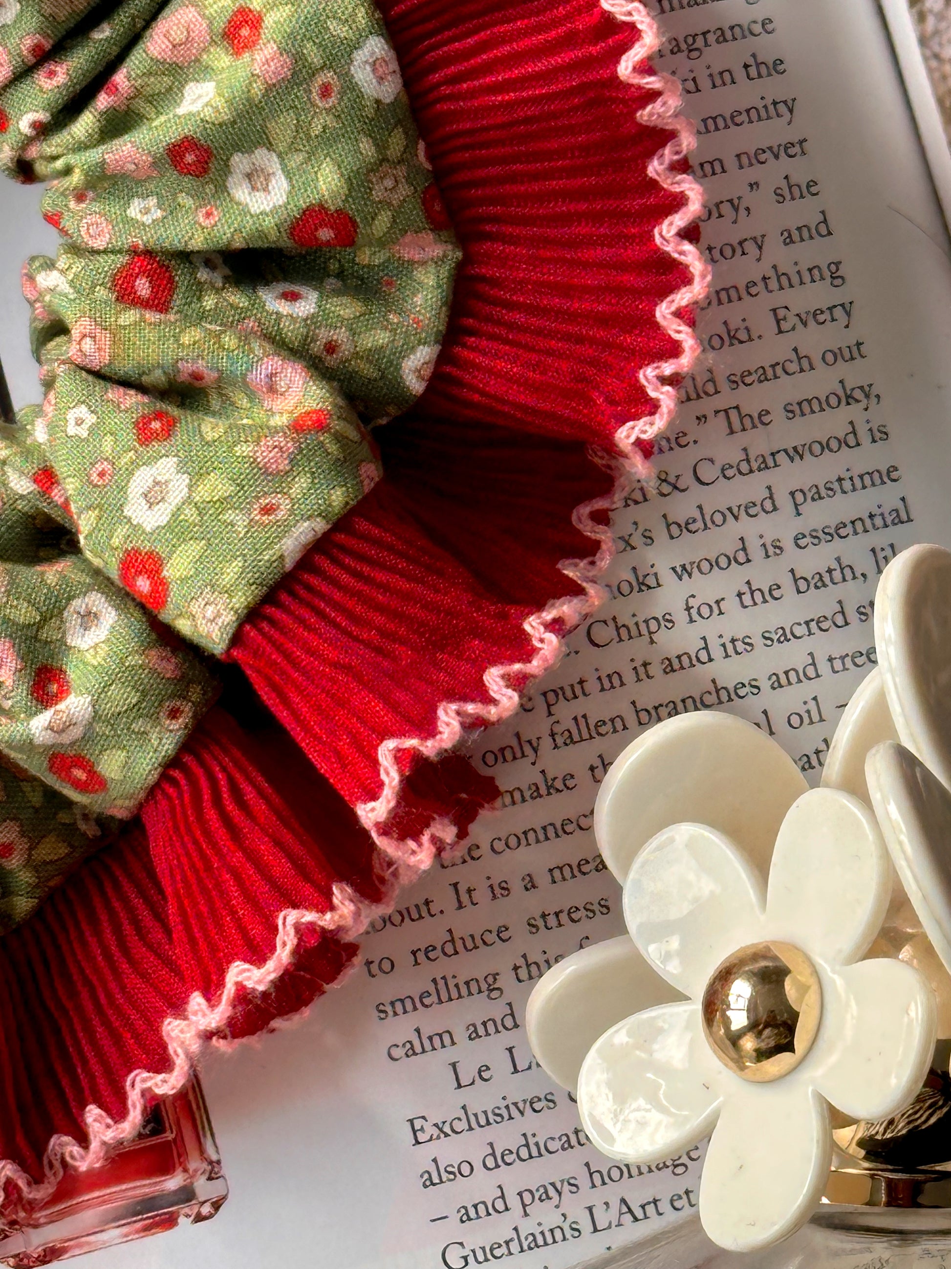 Embrace the scrunchie trend with this dark green ditsy floral scrunchie with a red and pink frill trim. These single-layer trim scrunchies are perfect for making your hair stand out all year round.