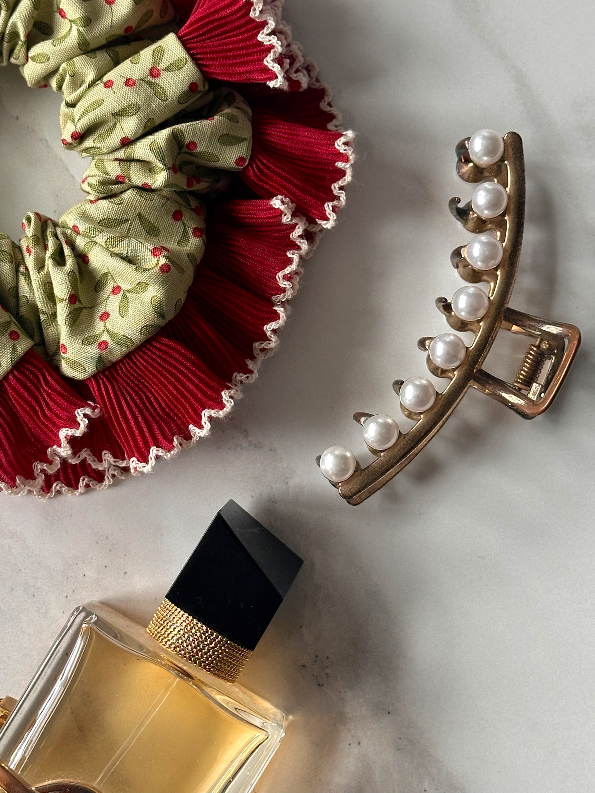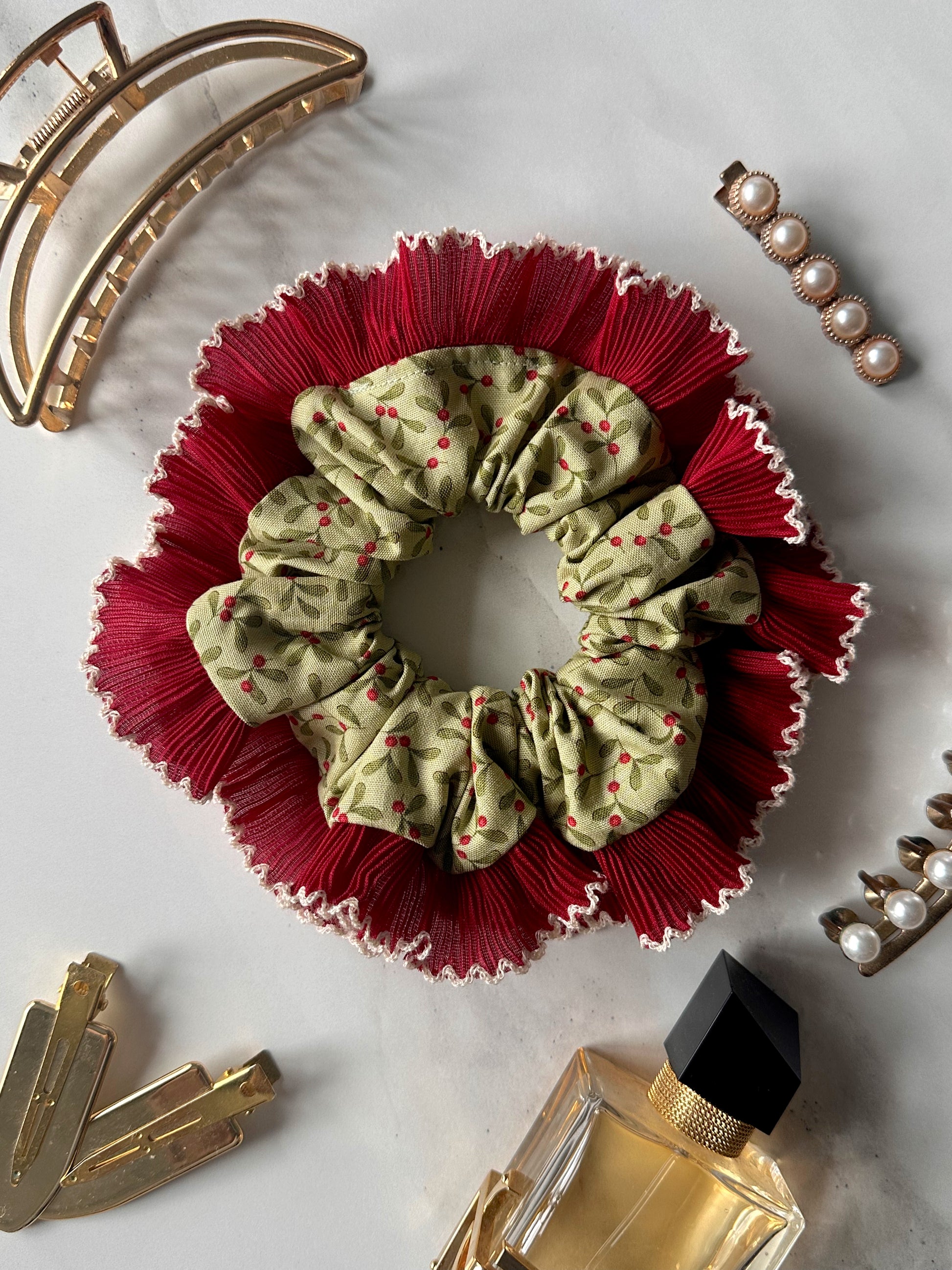 Embrace the scrunchie trend with this green mistletoe print scrunchie with a red and white frill trim. These single-layer trim scrunchies are perfect for making your hair stand out all year round.
