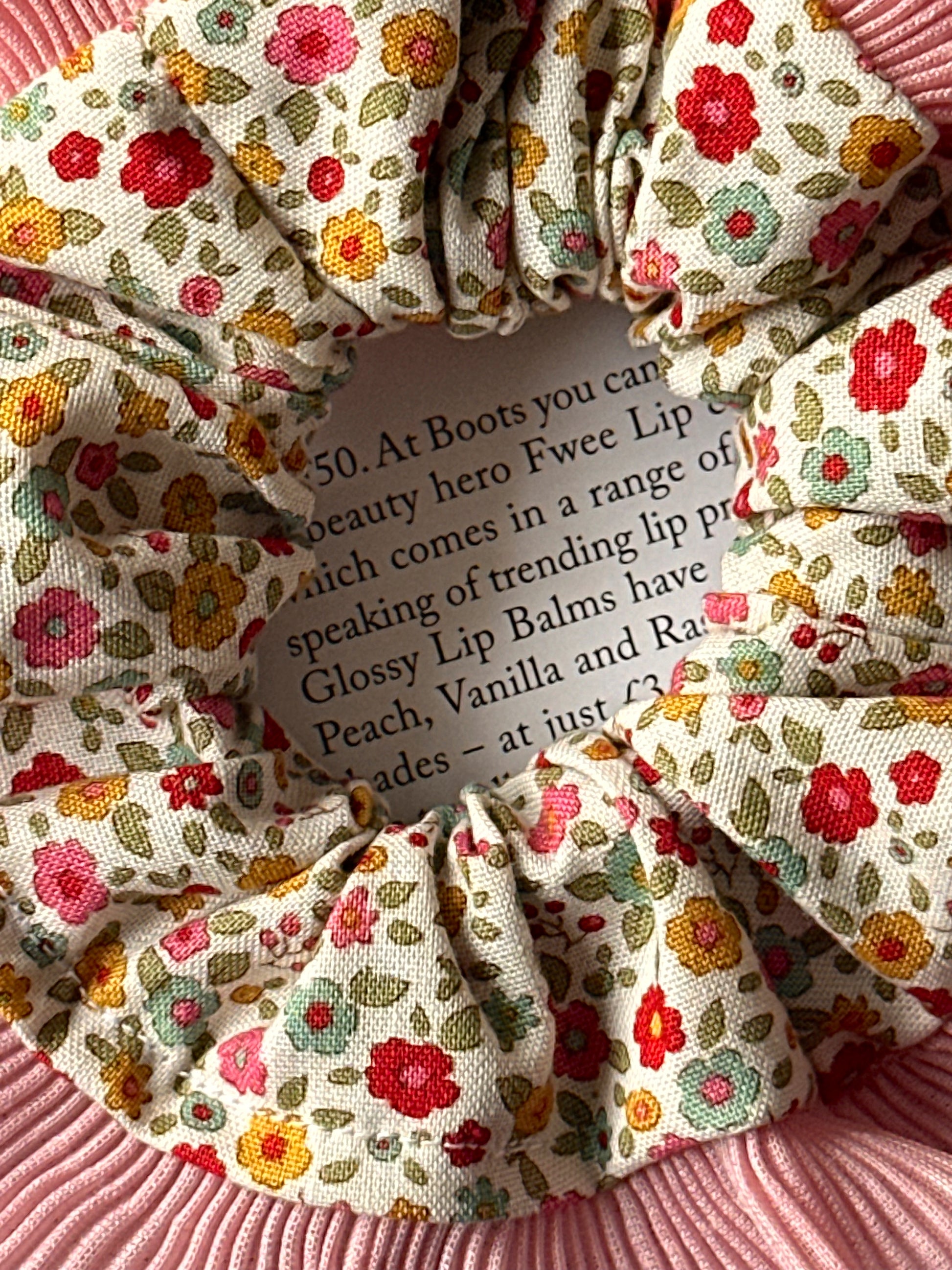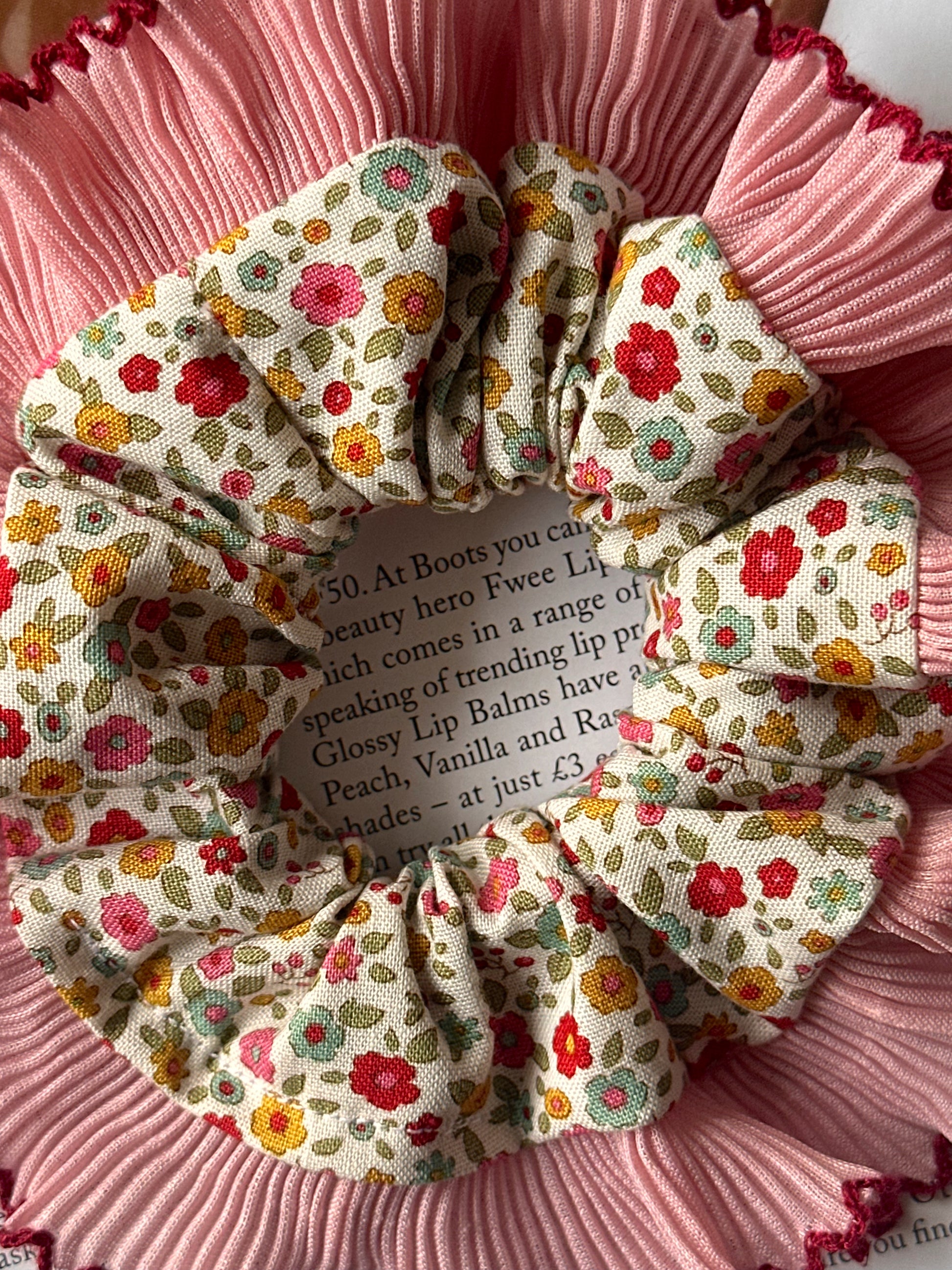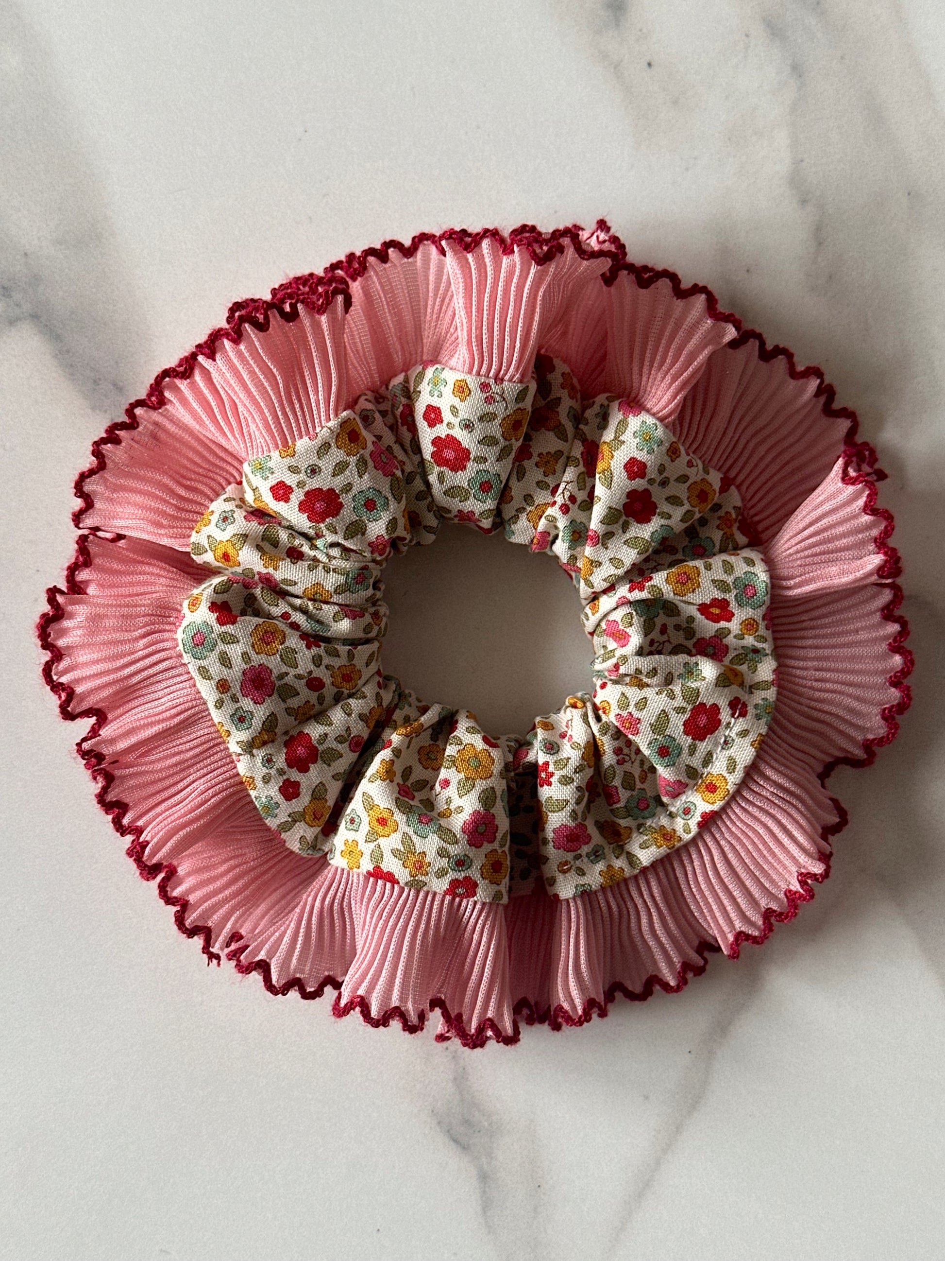 Mini Cream Floral Scrunchie with Pink Frill Trim