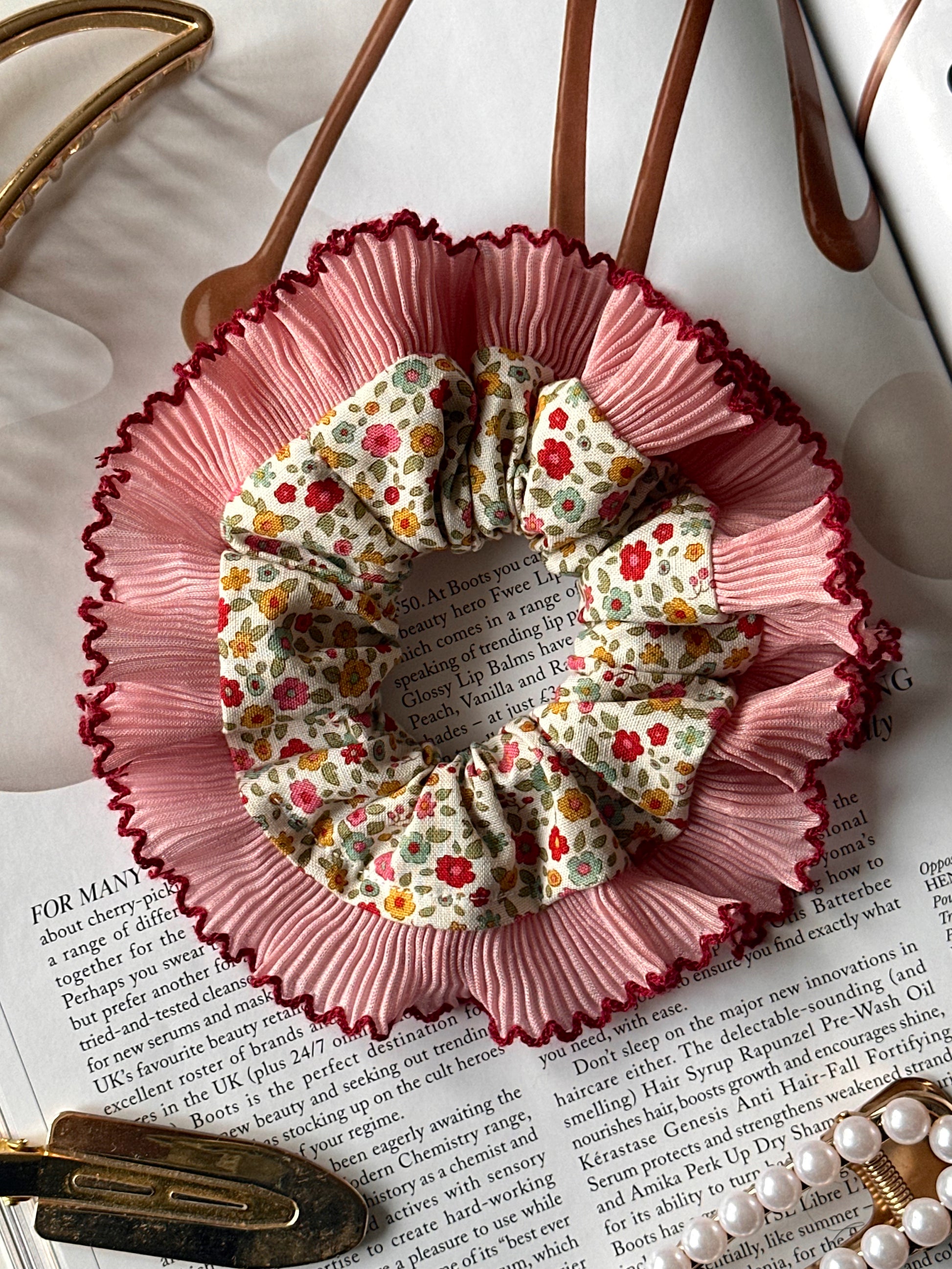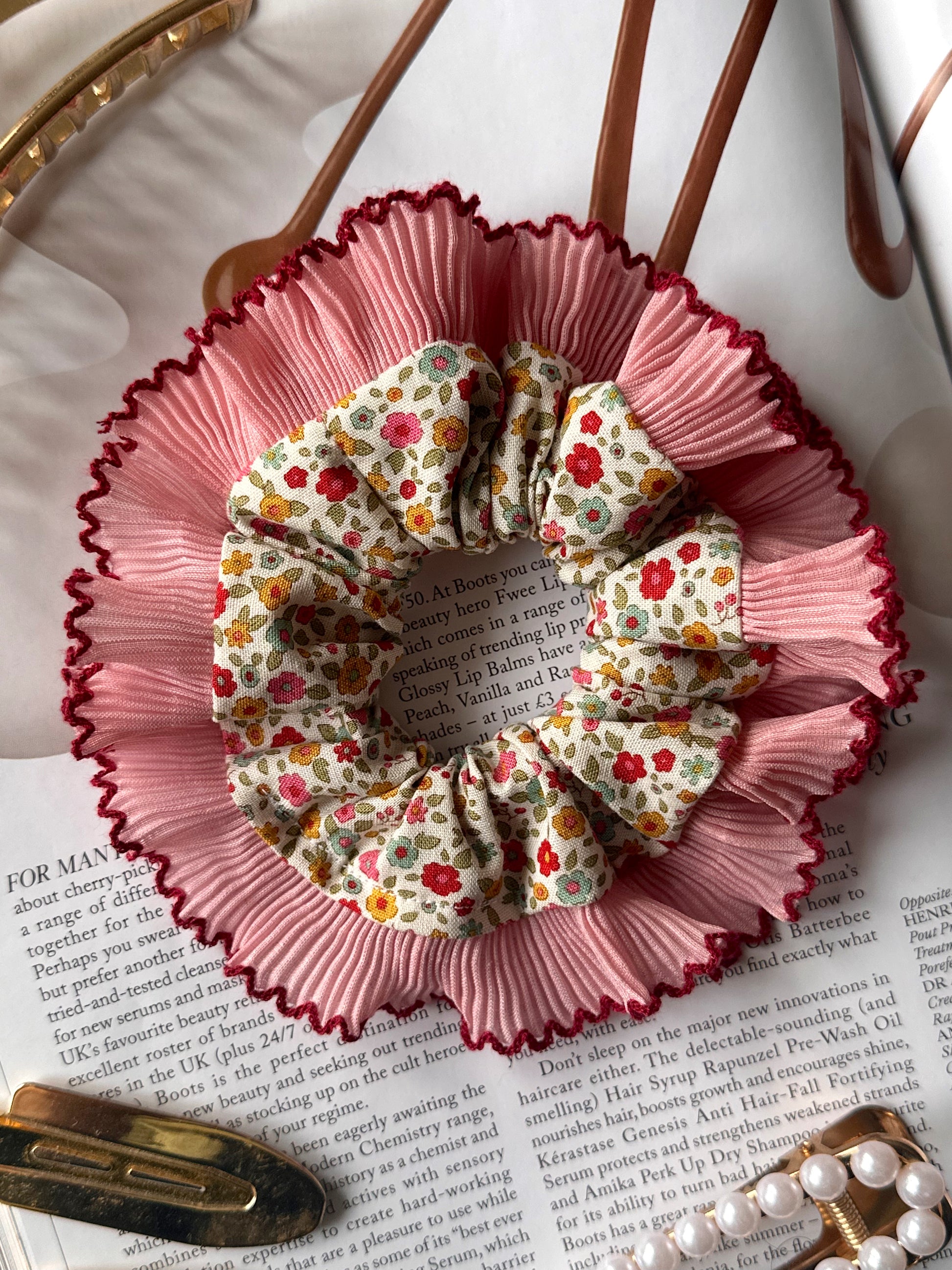 Embrace the scrunchie trend with this cream multi-coloured floral scrunchie with a pink frill trim. These single-layer trim scrunchies are perfect for making your hair stand out all year round.
