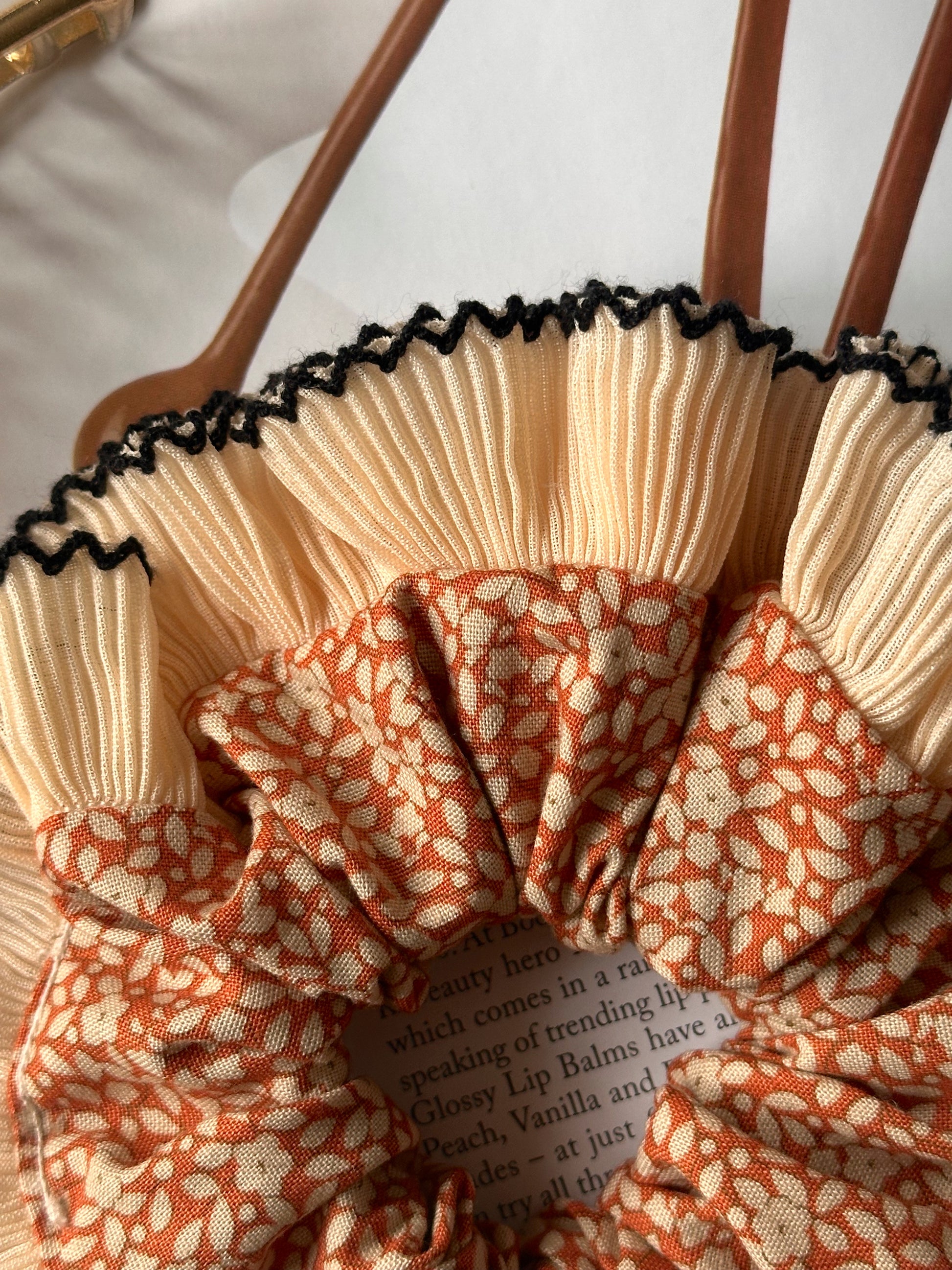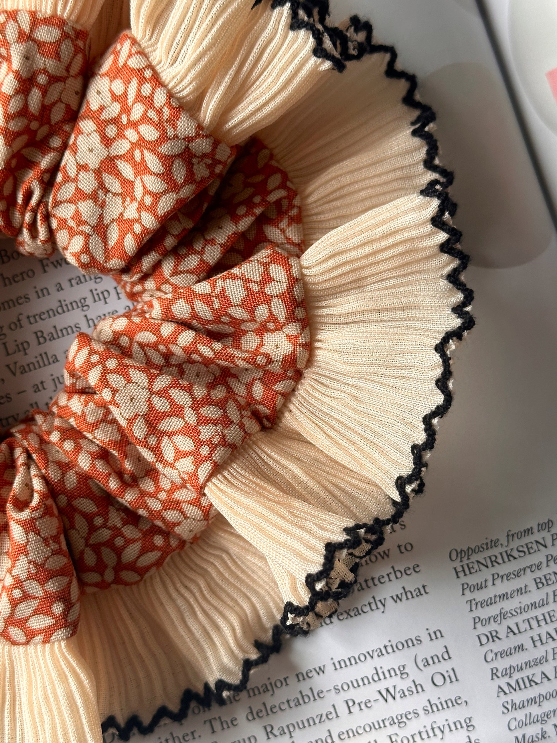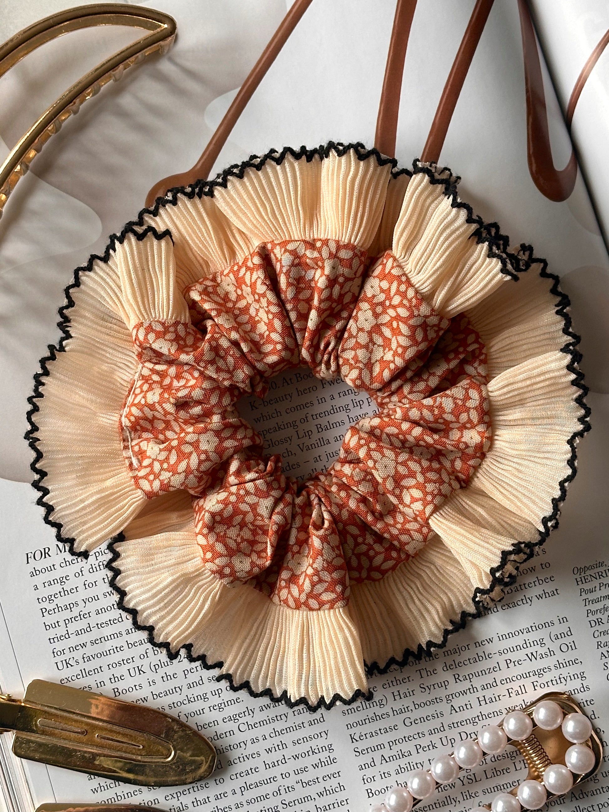 Embrace the scrunchie trend with this orange floral scrunchie with a cream and black frill trim. These single-layer trim scrunchies are perfect for making your hair stand out all year round.