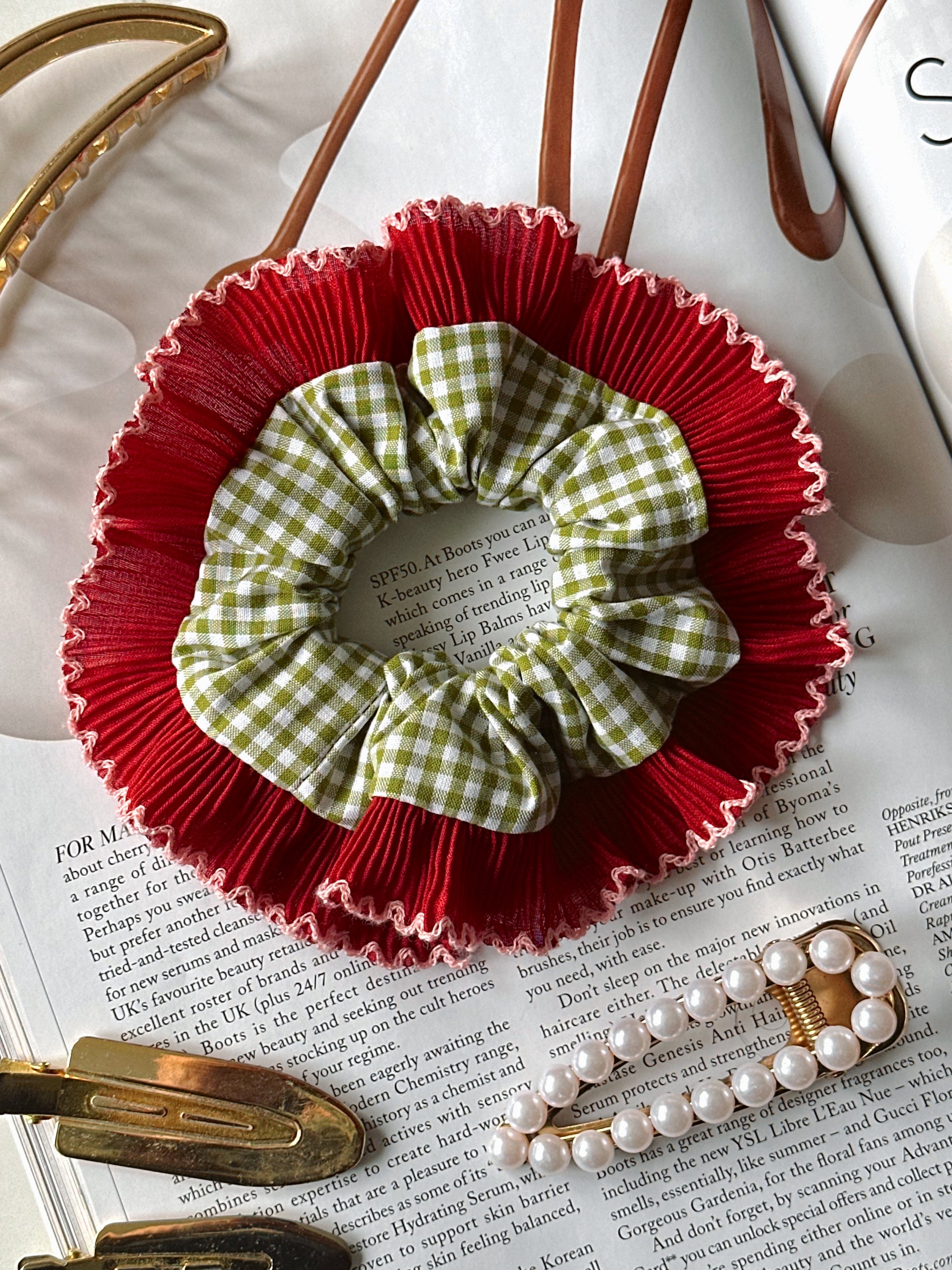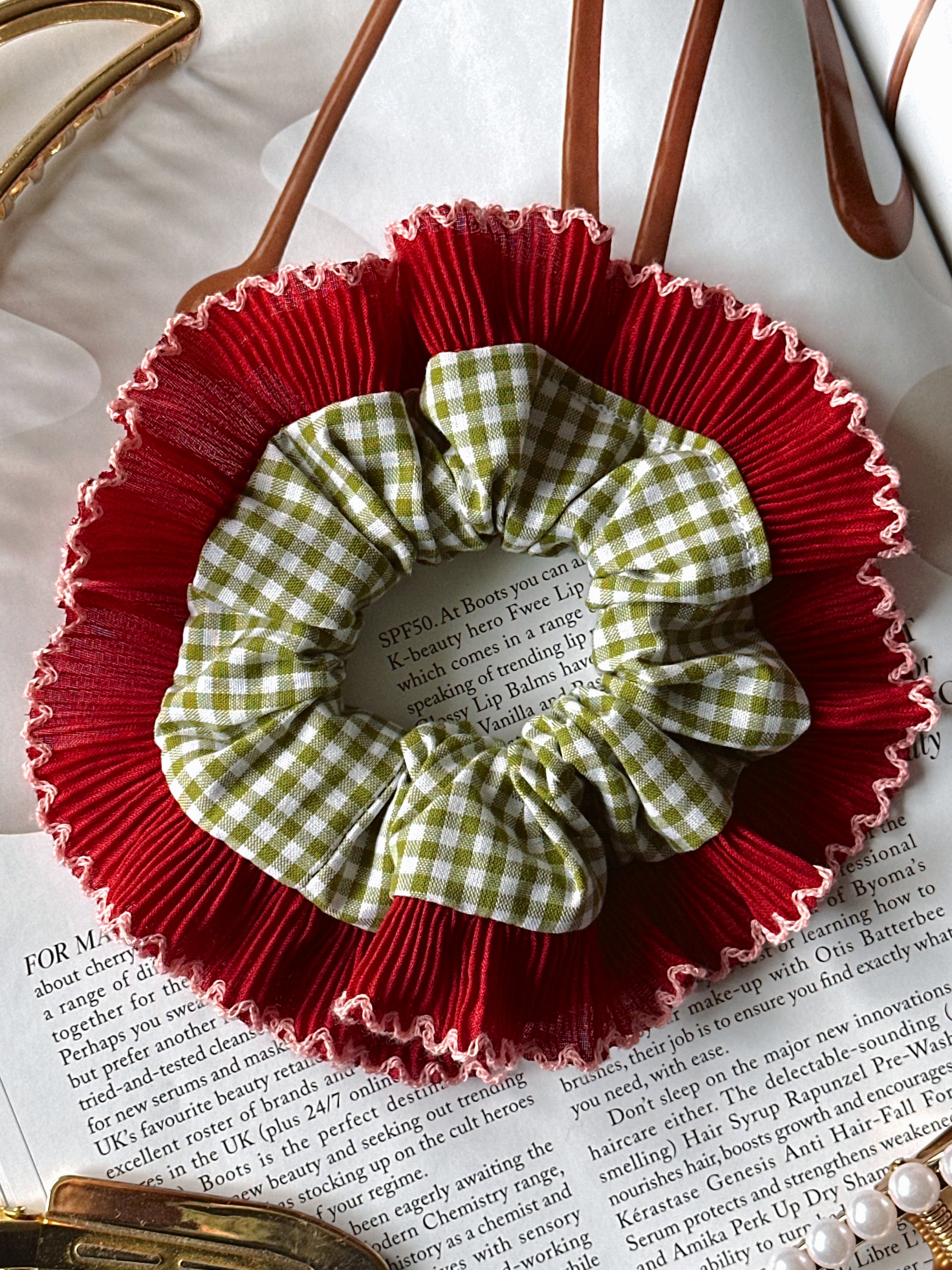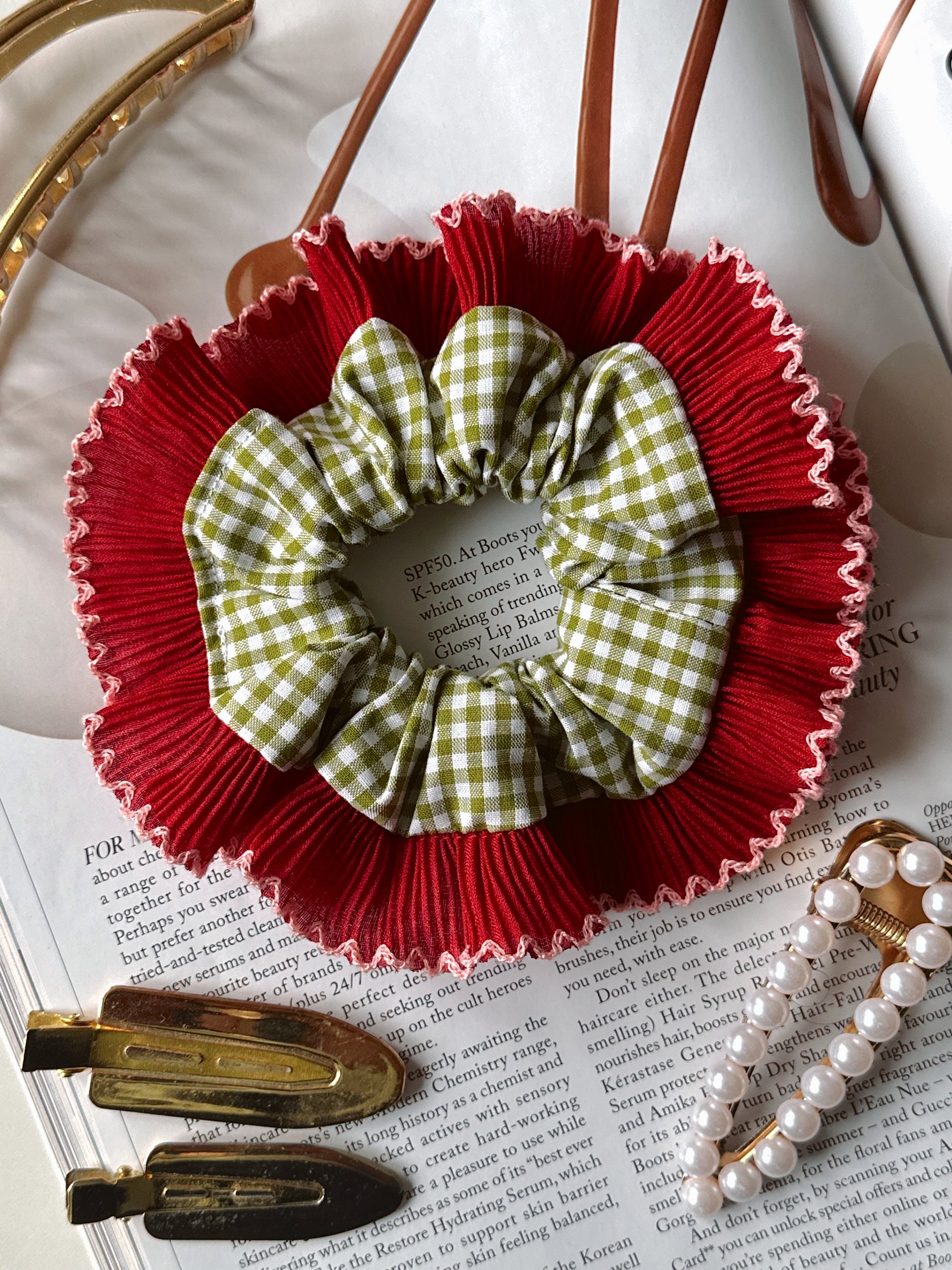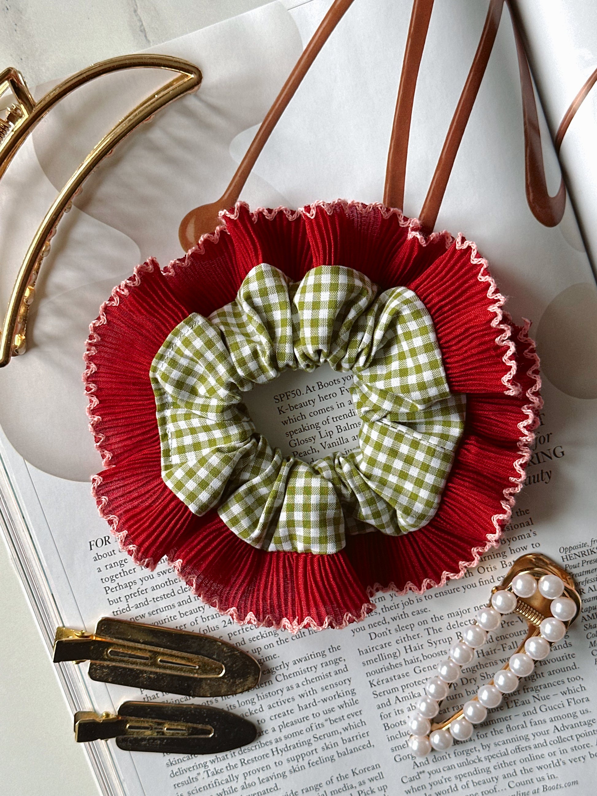 Embrace the scrunchie trend with this stunning olive green gingham scrunchie with a red and pink frill trim. These single-layer trim scrunchies are perfect for making your hair stand out all year round.
