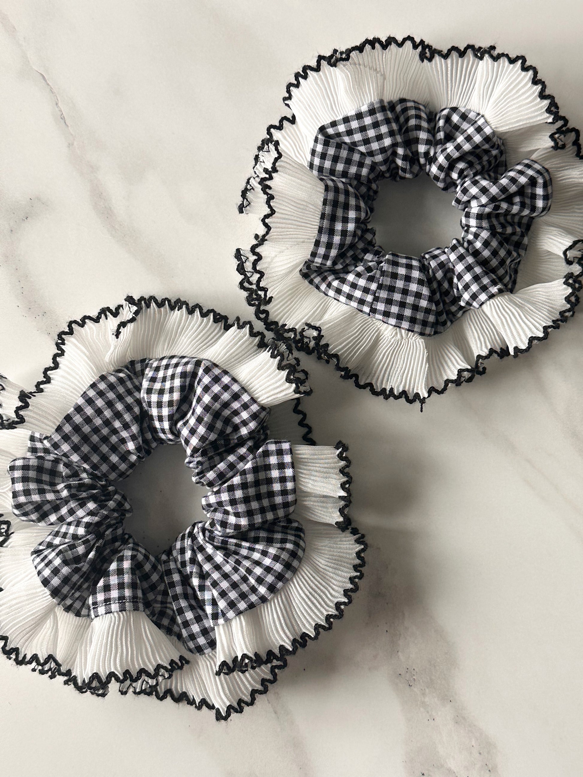 Mini Oversized Black Gingham Scrunchie with White Frill Trim