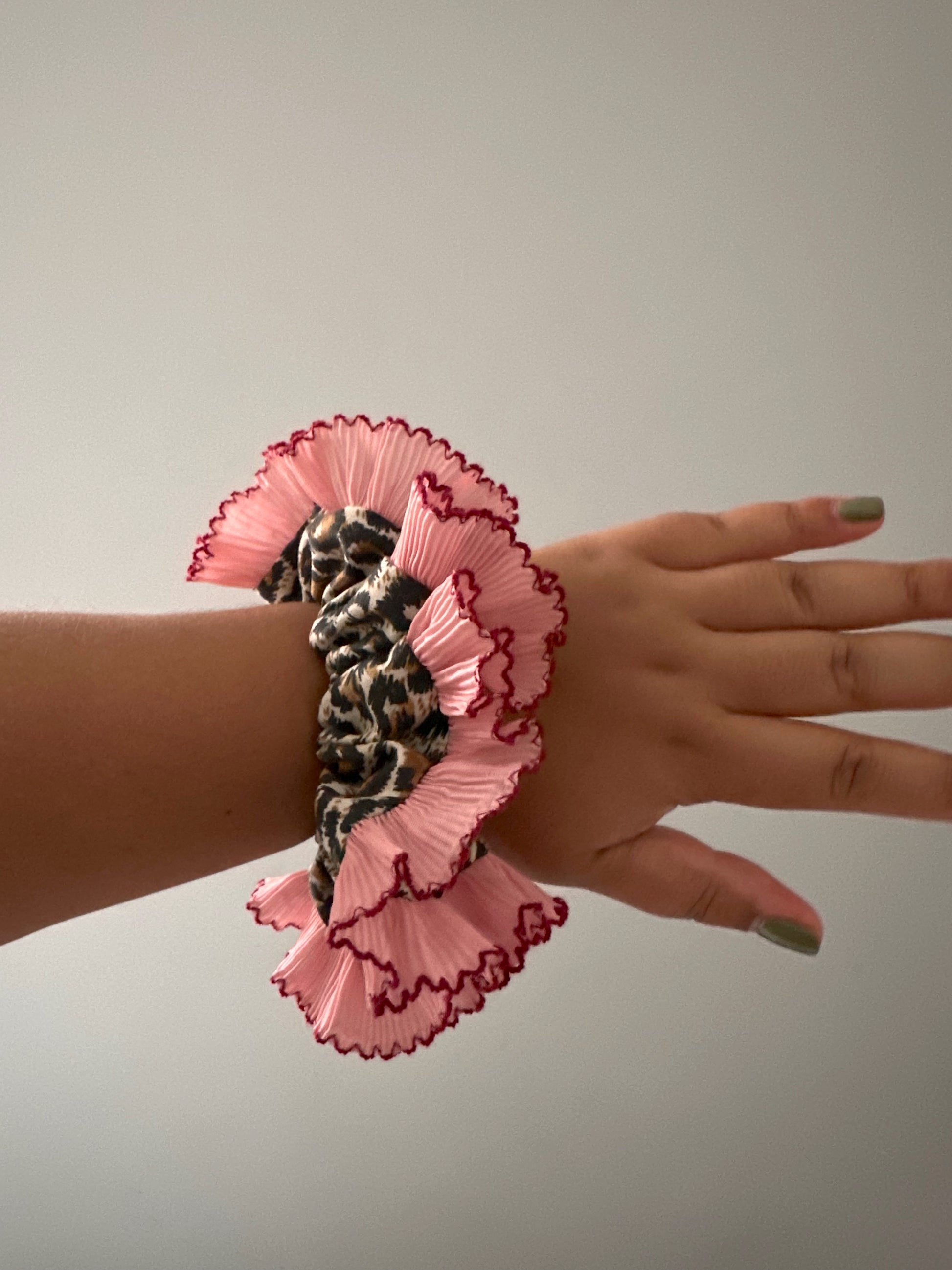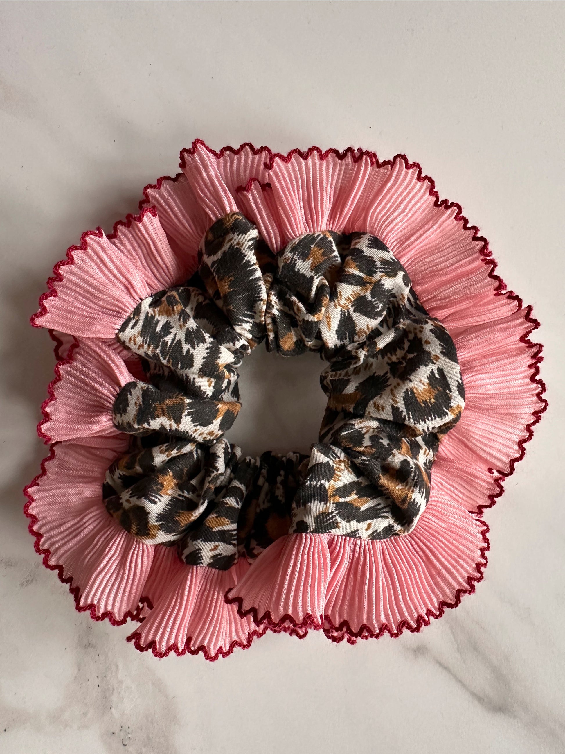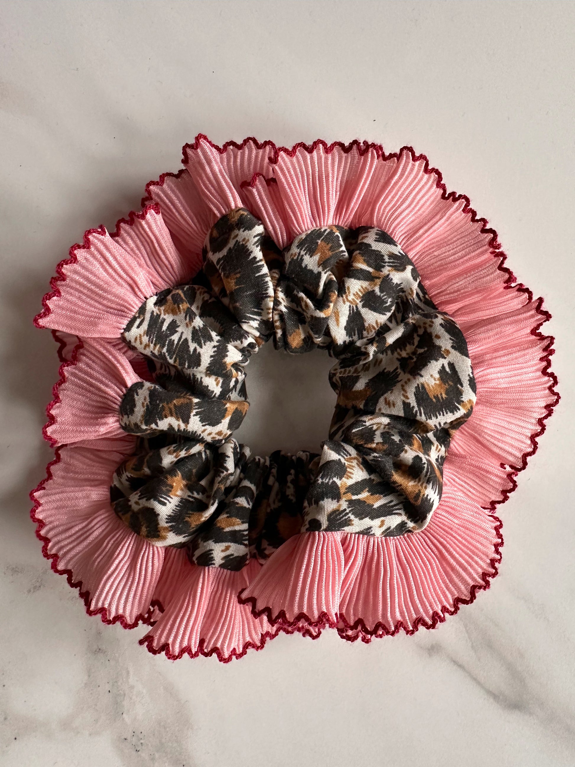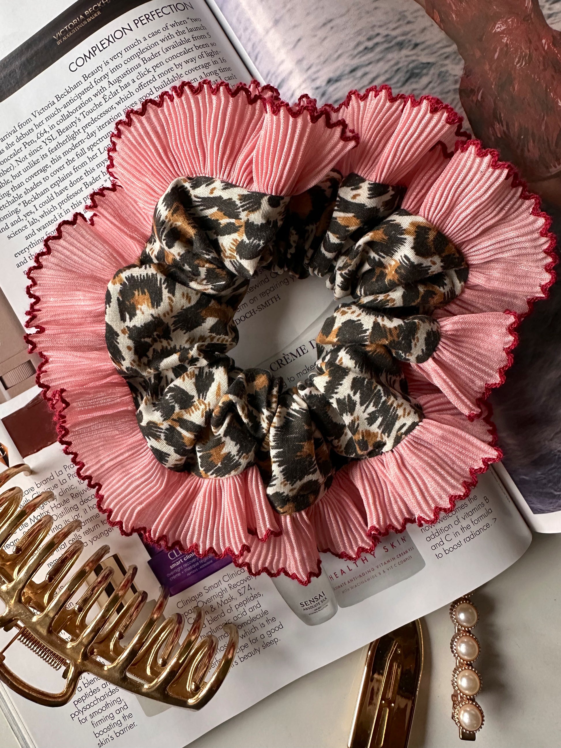 Embrace the scrunchie trend with this stunning leopard print scrunchie with a pink and red frill trim. These single-layer trim scrunchies are perfect for making your hair stand out all year round.