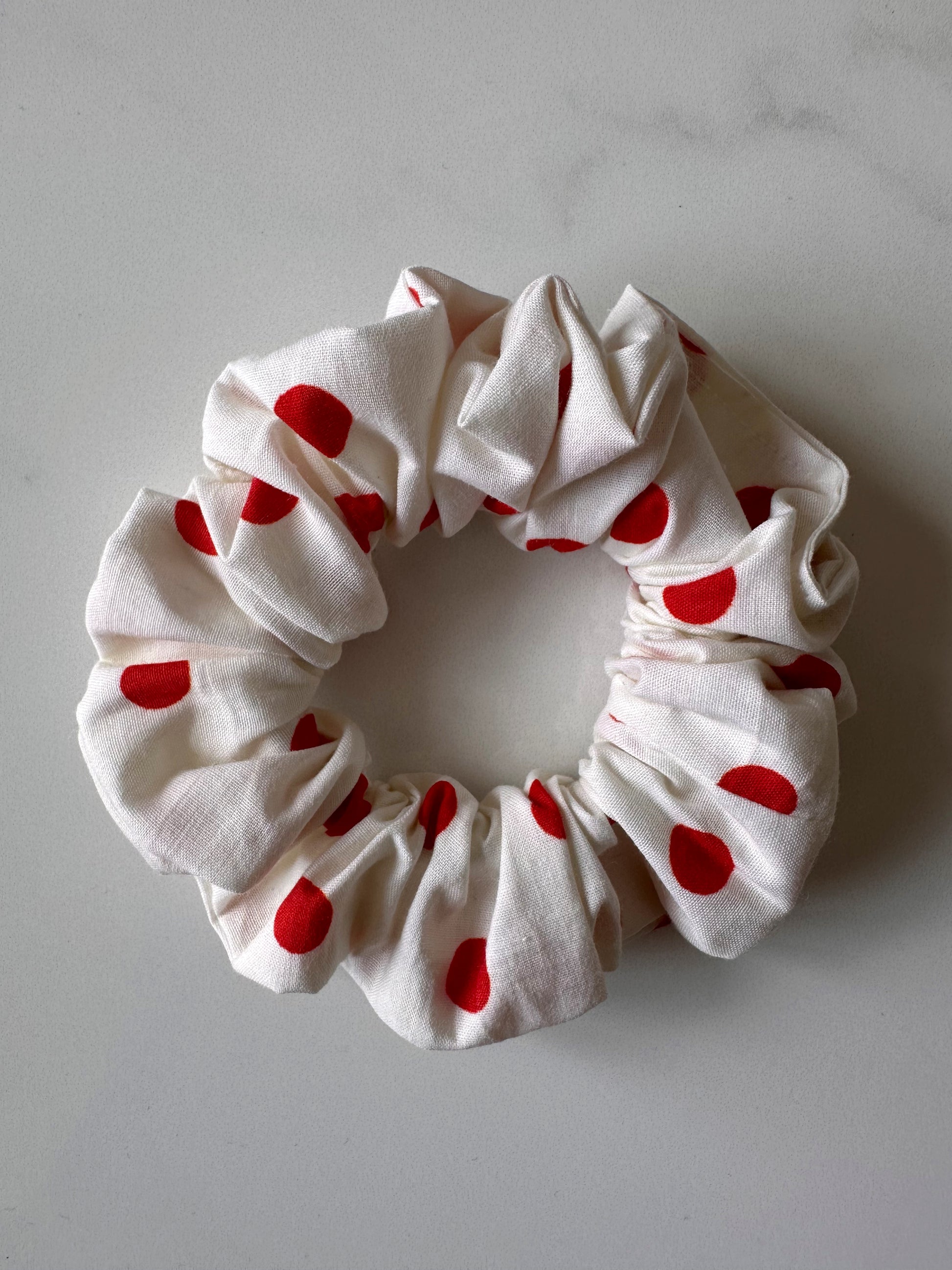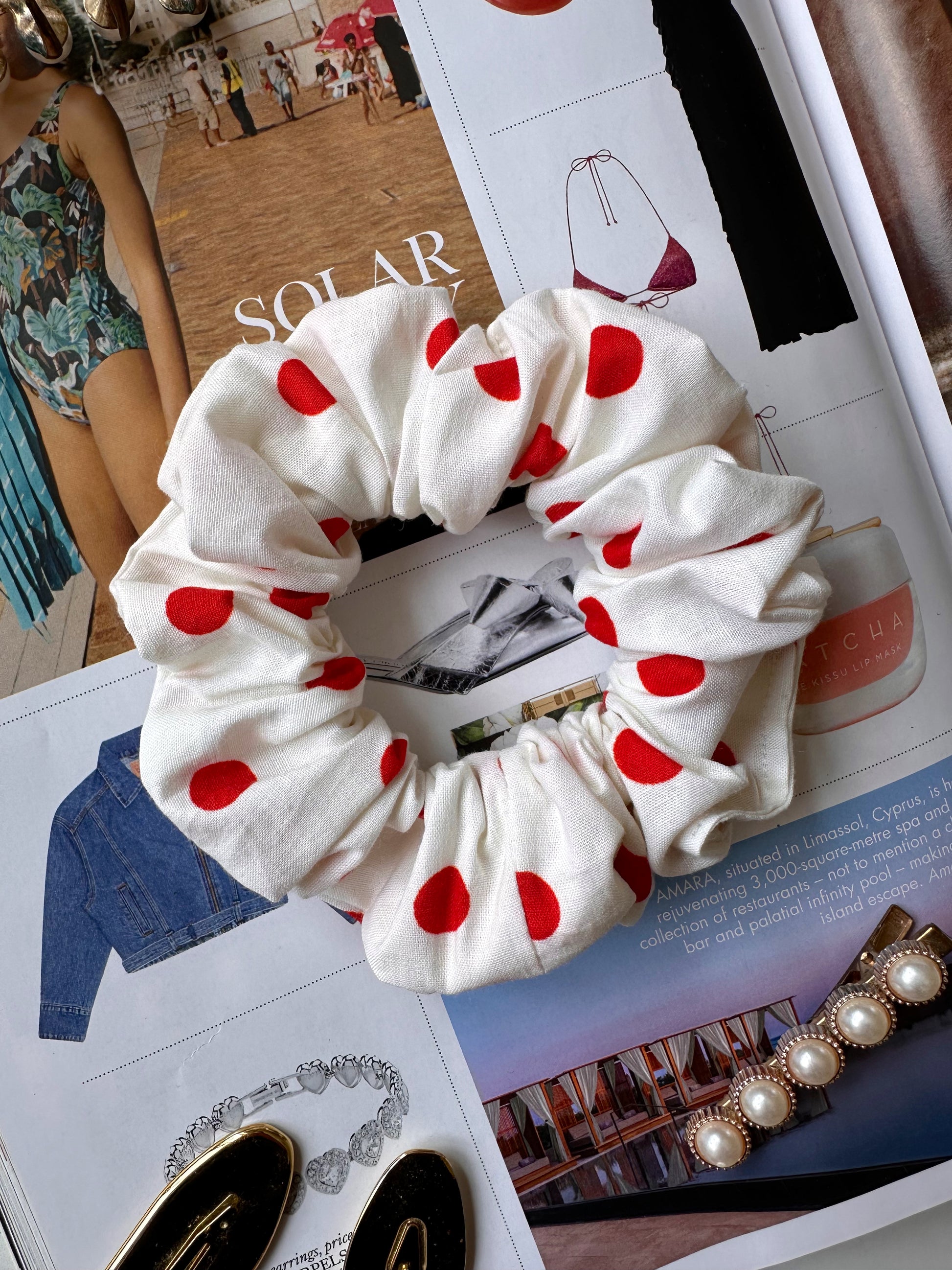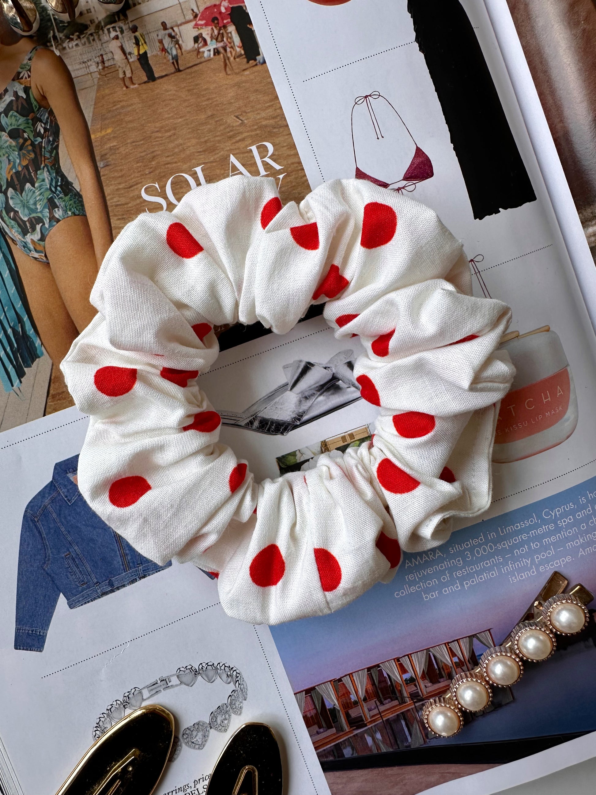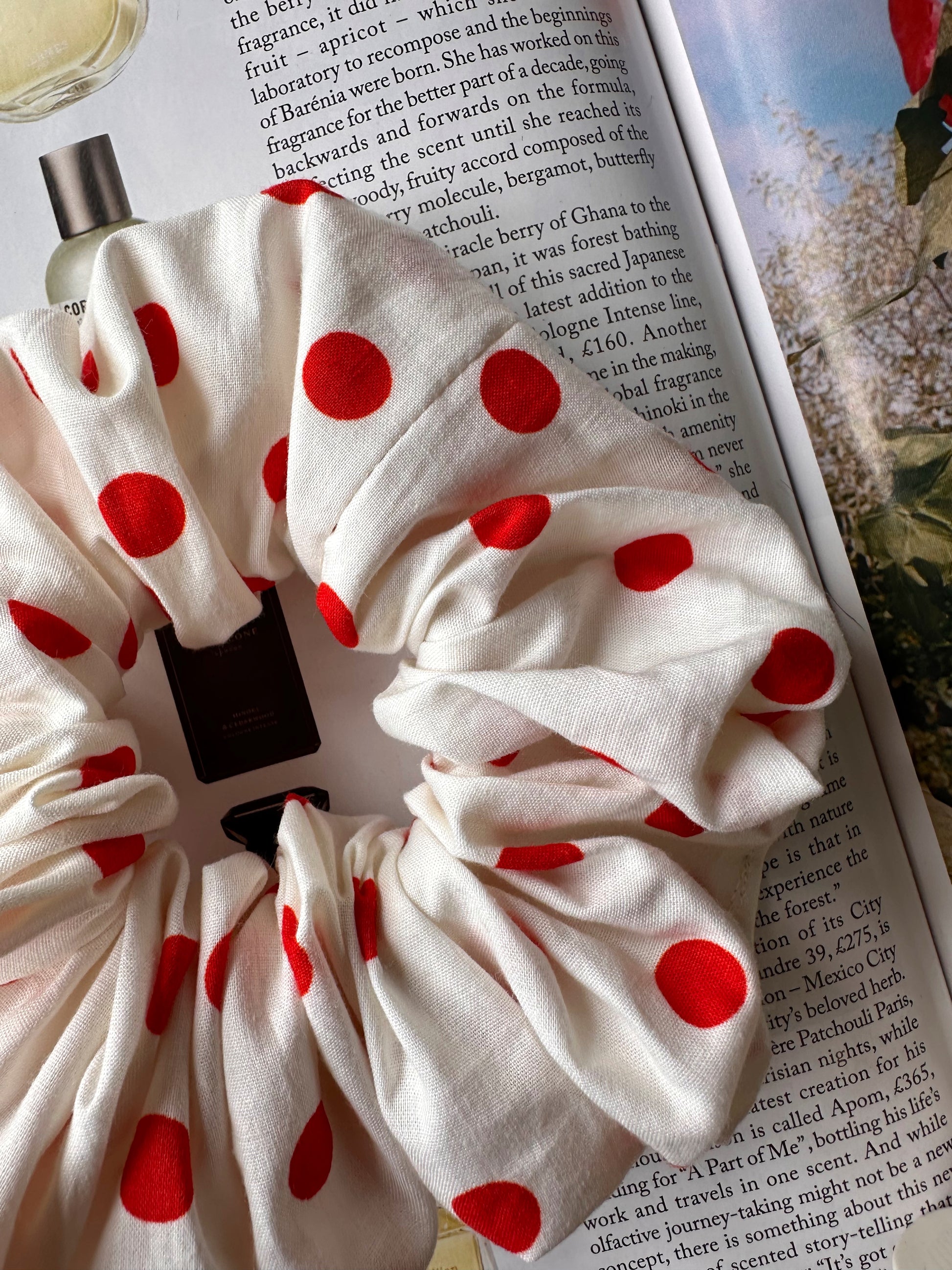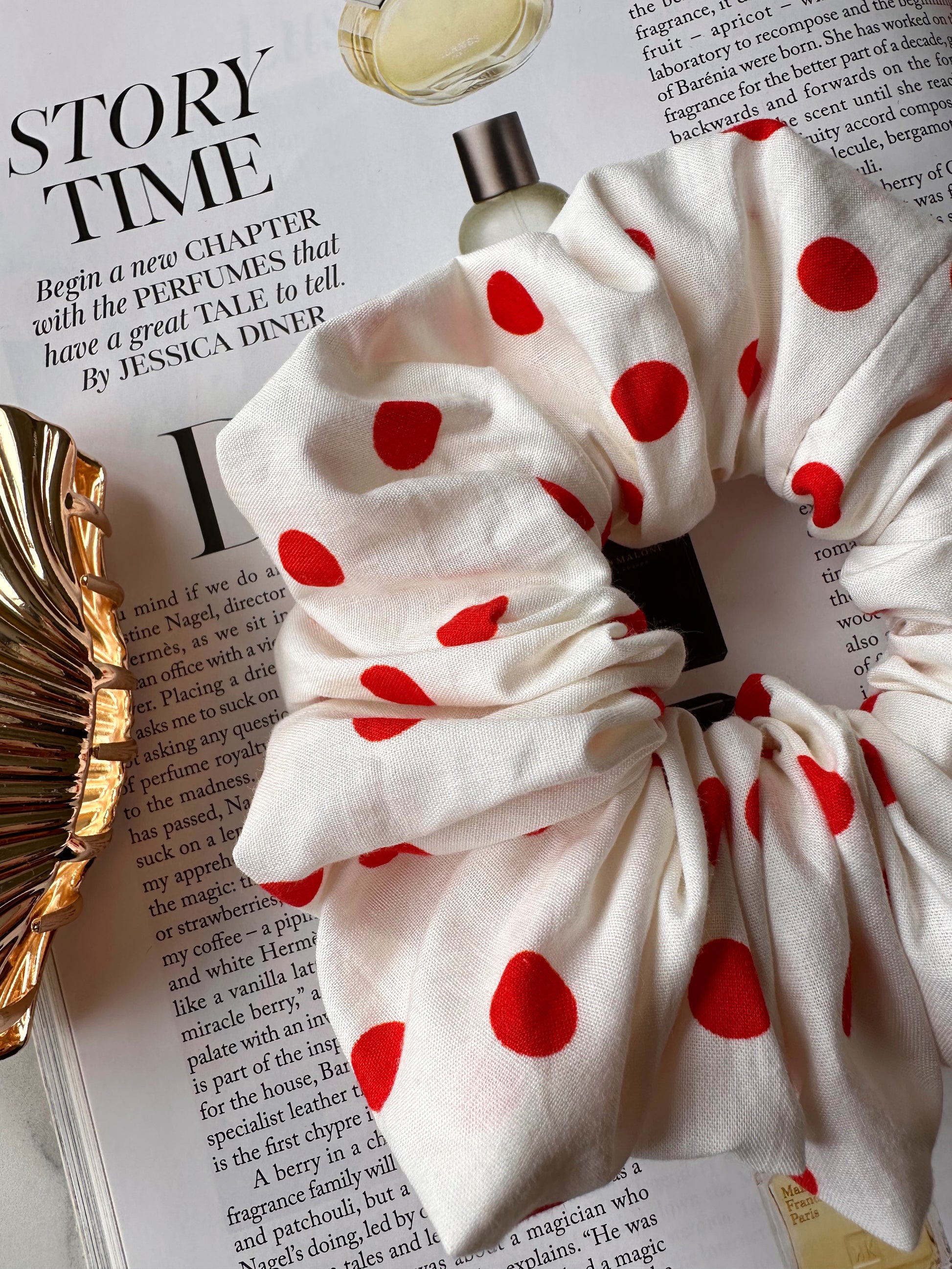 Elevate your hair game with this gorgeous 100% cotton white and red polkadot scrunchie.