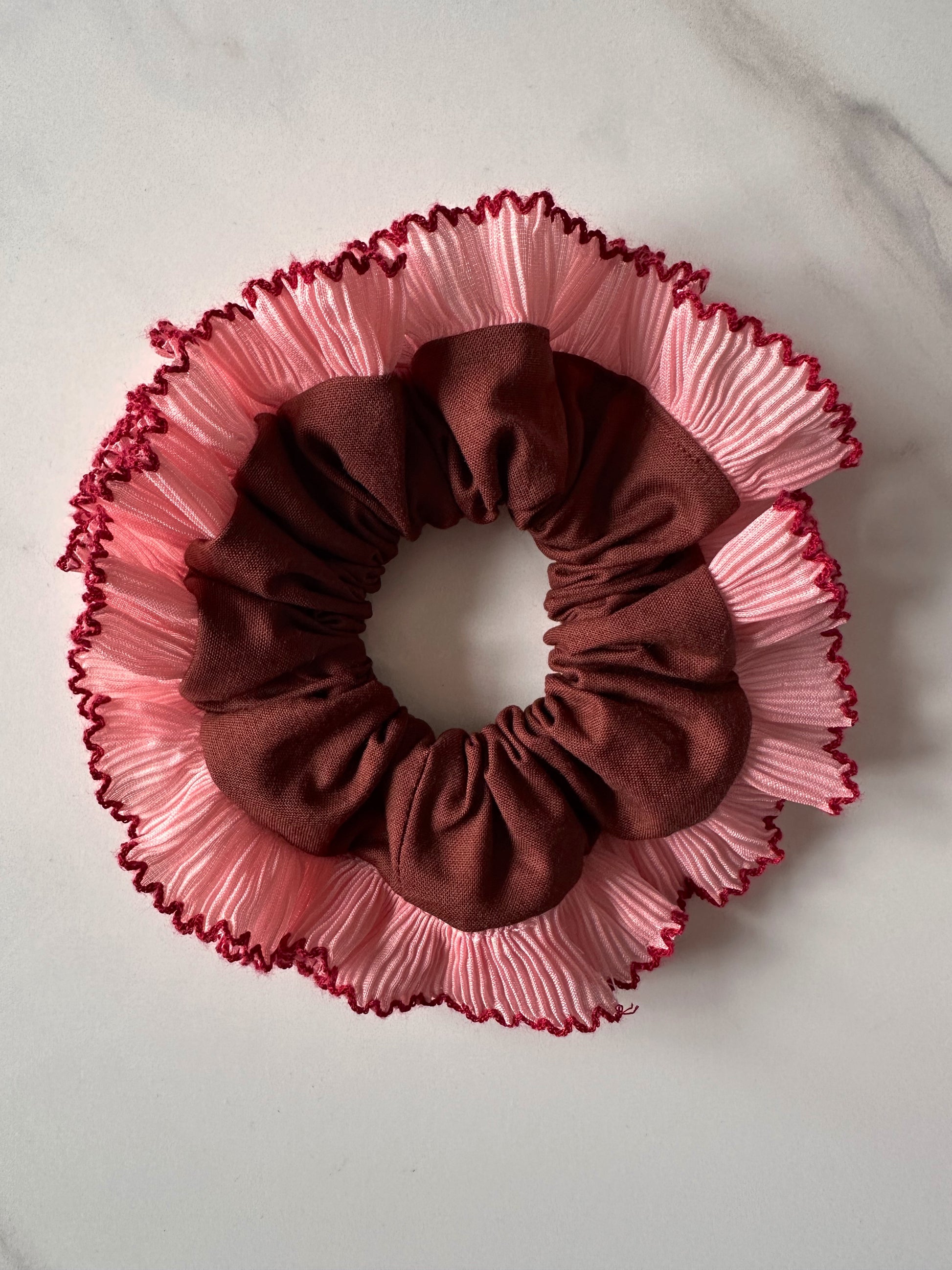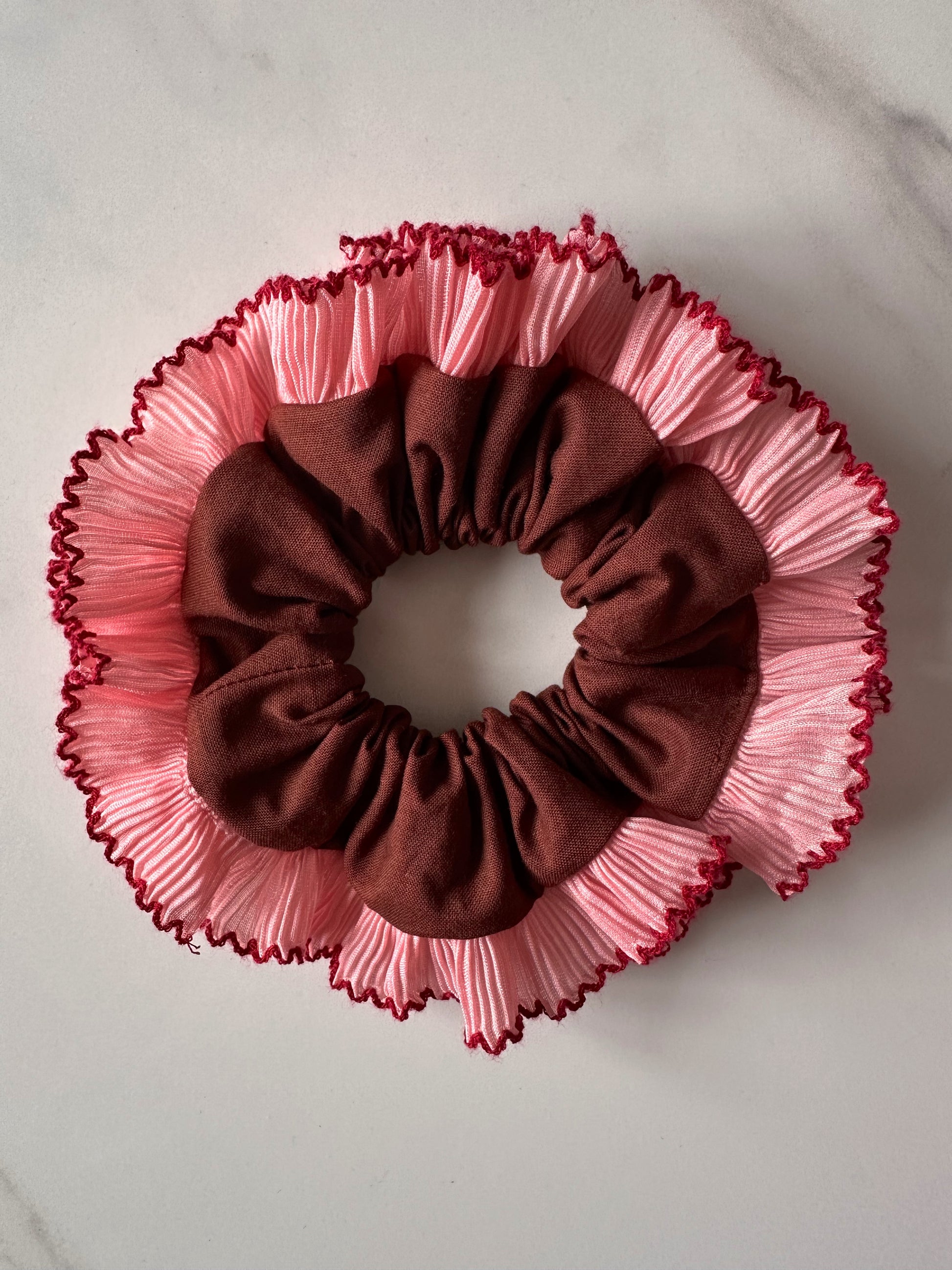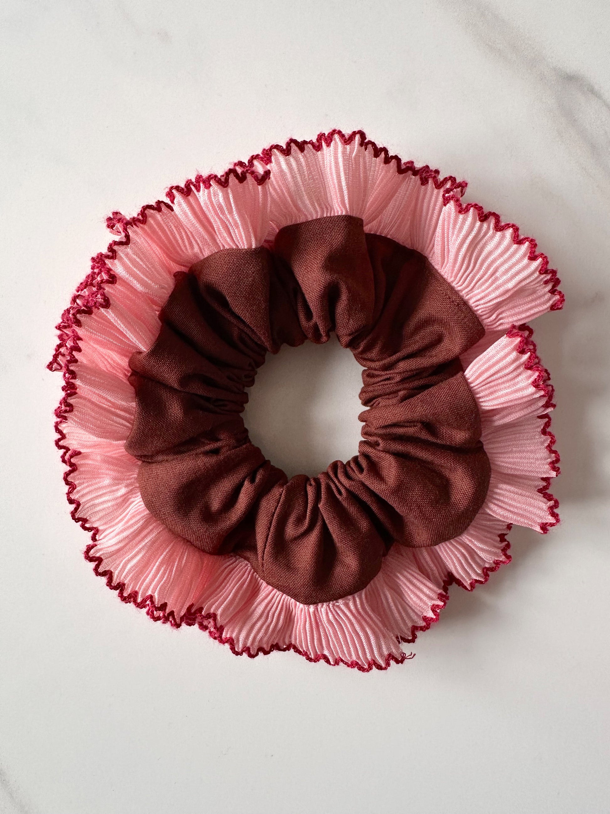 Embrace the scrunchie trend with this chocolate brown scrunchie with a pink and red frill trim. These single-layer trim scrunchies are perfect for making your hair stand out all year round.
