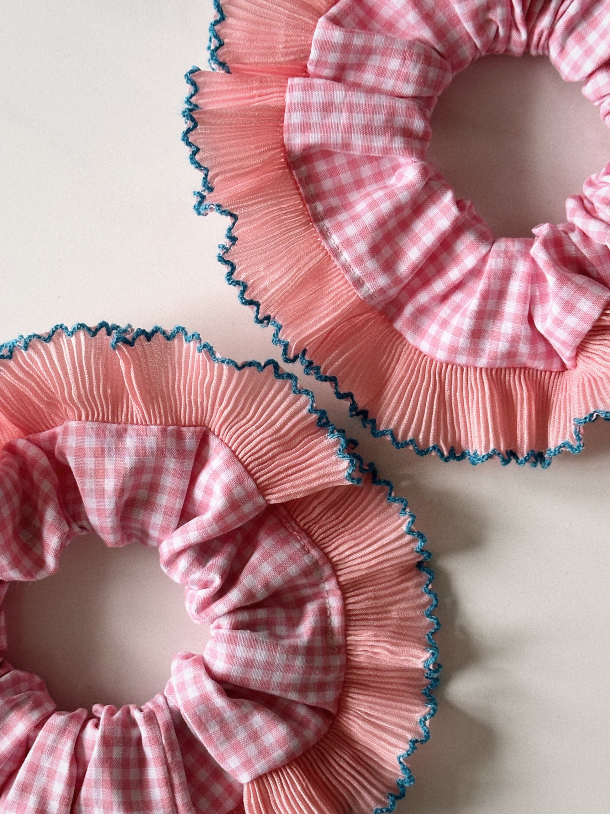 XL Pink Gingham Scrunchie with Pink and Blue Frill Trim